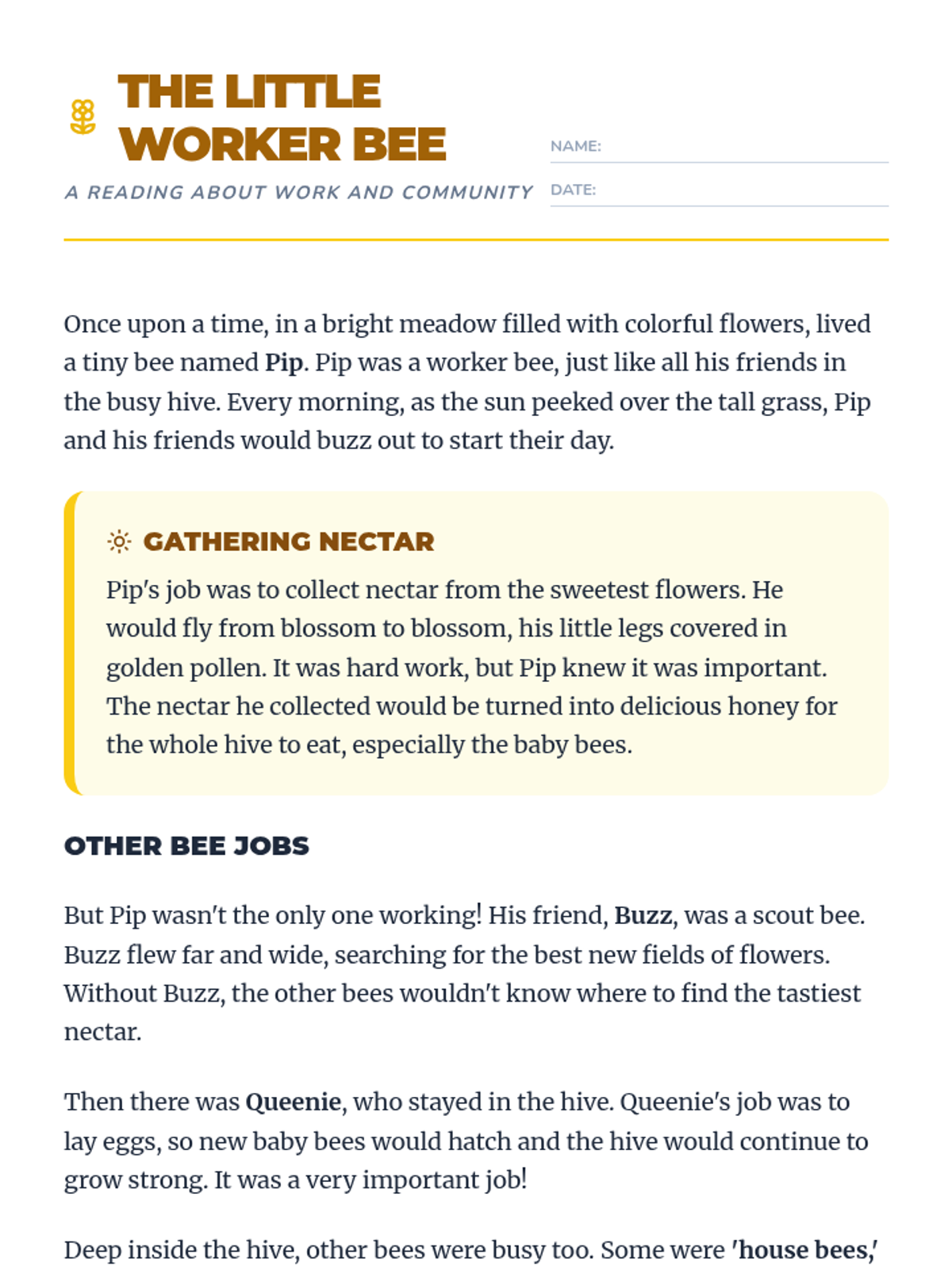 This lesson introduces 3rd-grade students to the concepts of earning money through work, the variety of jobs in a community, and the difference between needs and wants. Through a story about a worker bee and reflective journaling, students build foundational financial literacy.