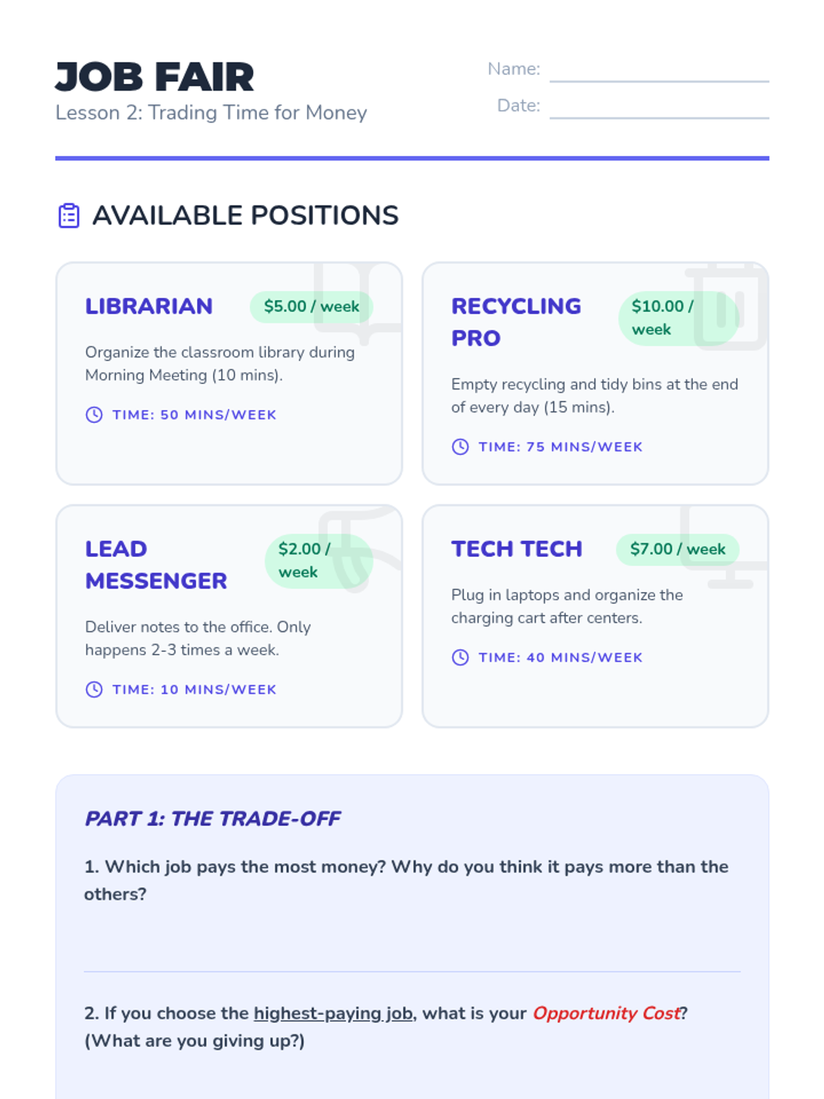 Students explore different ways people earn money and the concept of trading time for income. They engage in a role-play activity where they must choose between different 'jobs' based on time required and pay offered.