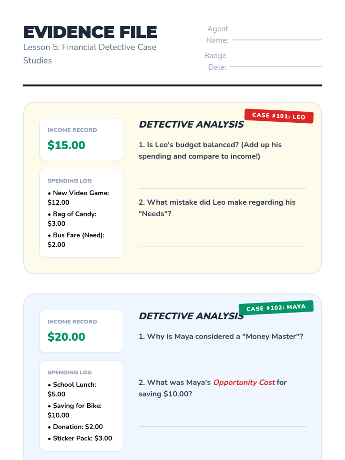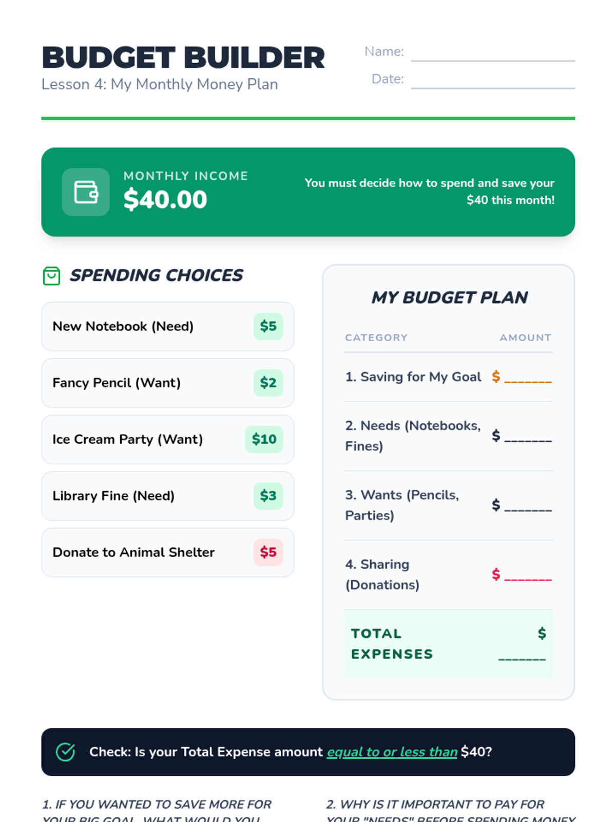 Students learn the difference between needs and wants and practice the 'Needs First' rule by managing a $20 budget to purchase essentials before luxuries.