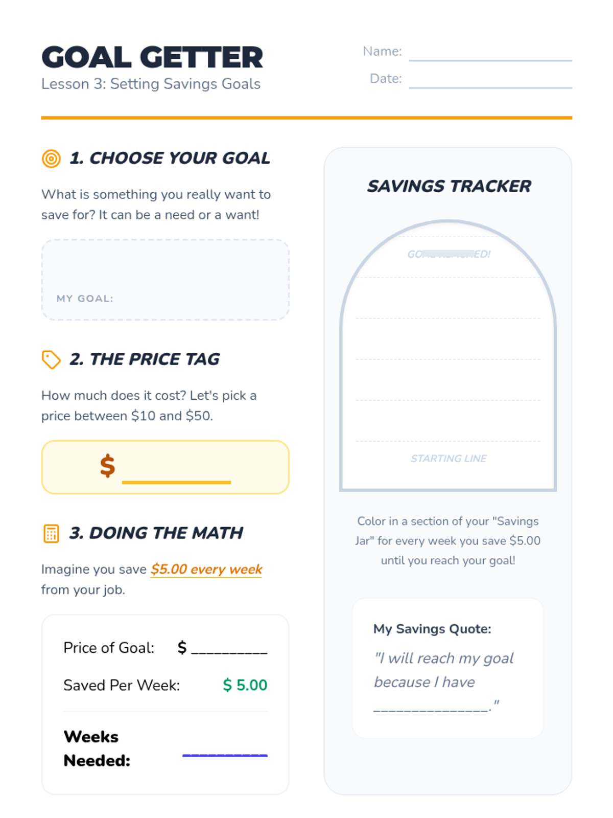 Students calculate savings timelines and design a visual roadmap to track their progress toward a chosen goal.