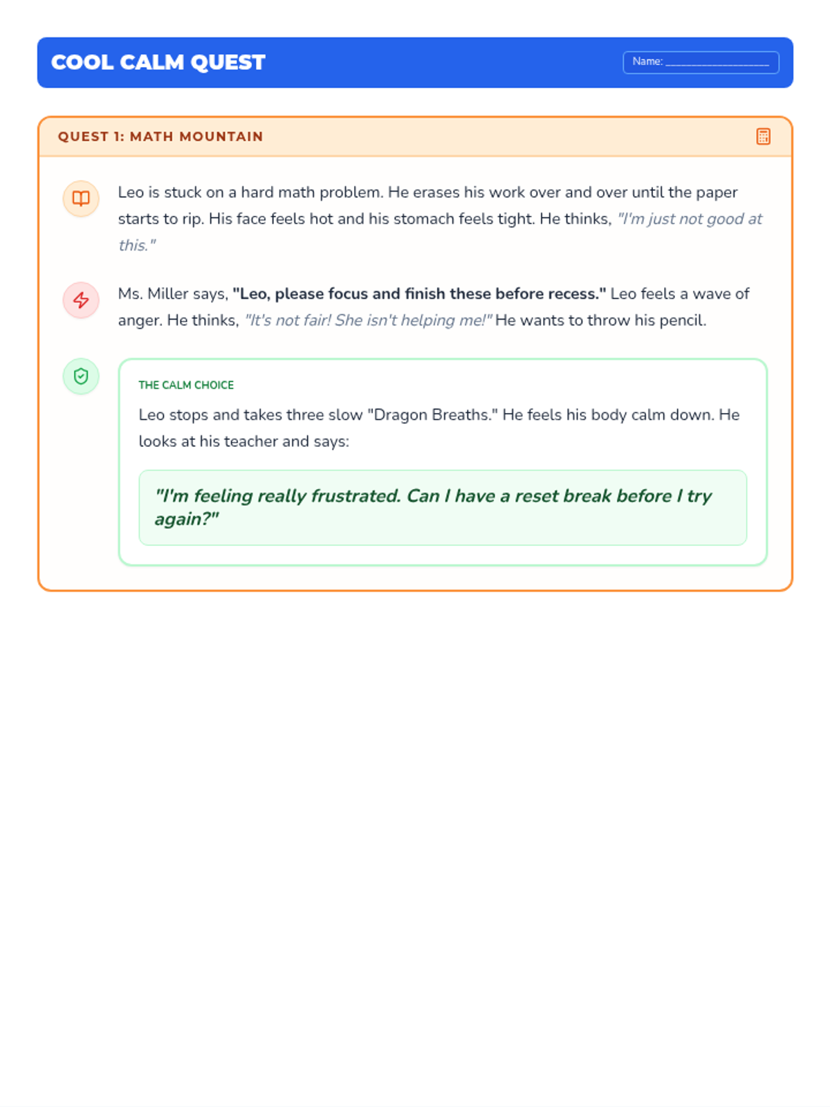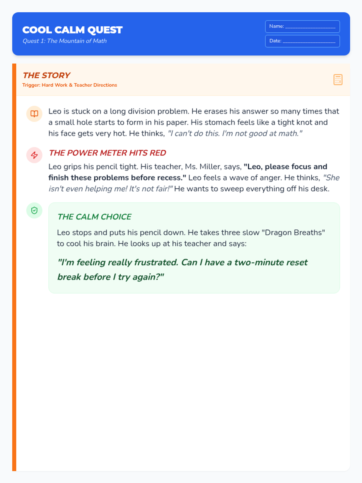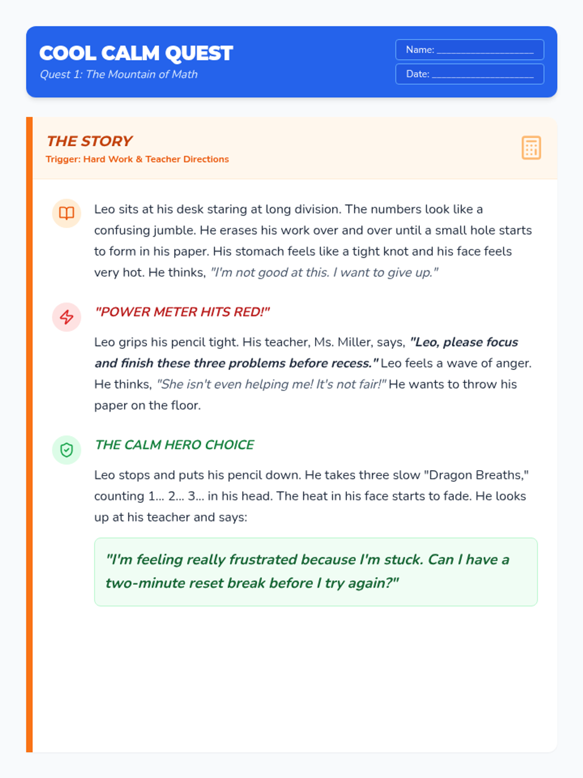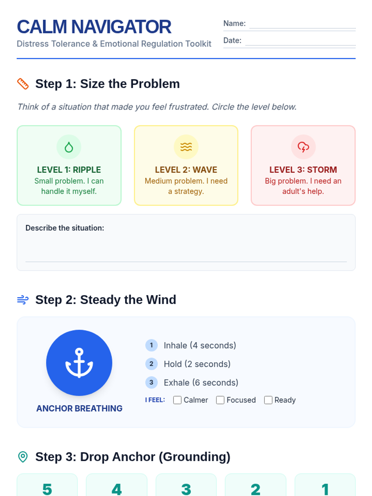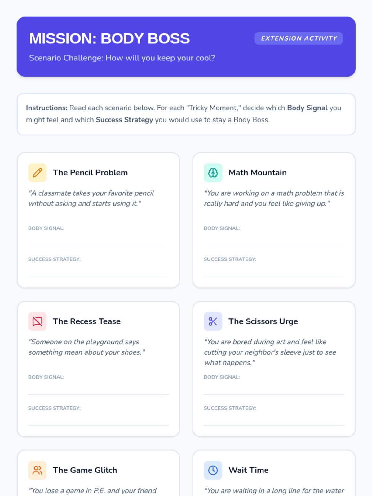 A lesson designed to help students distinguish between Small and Big Problems and choose safe regulation strategies instead of physical reactions. It includes a social story, practice worksheet, and strategy reference guide.