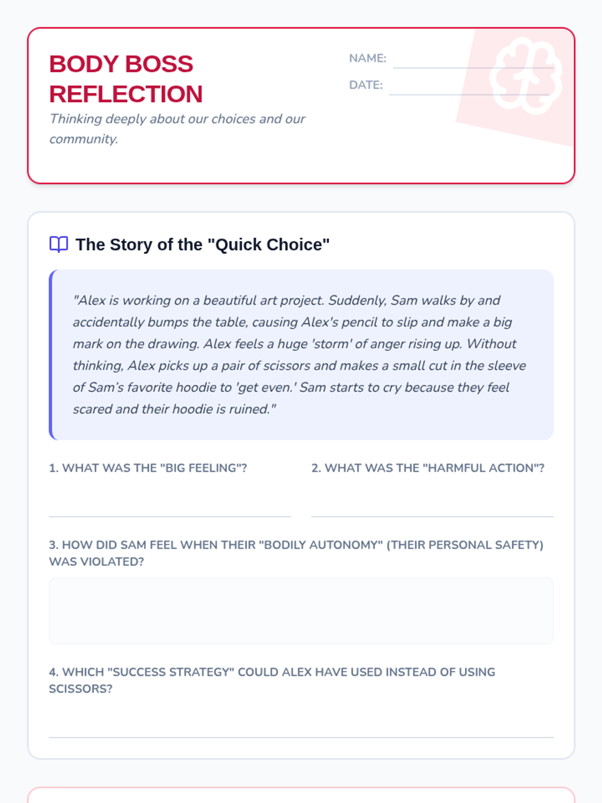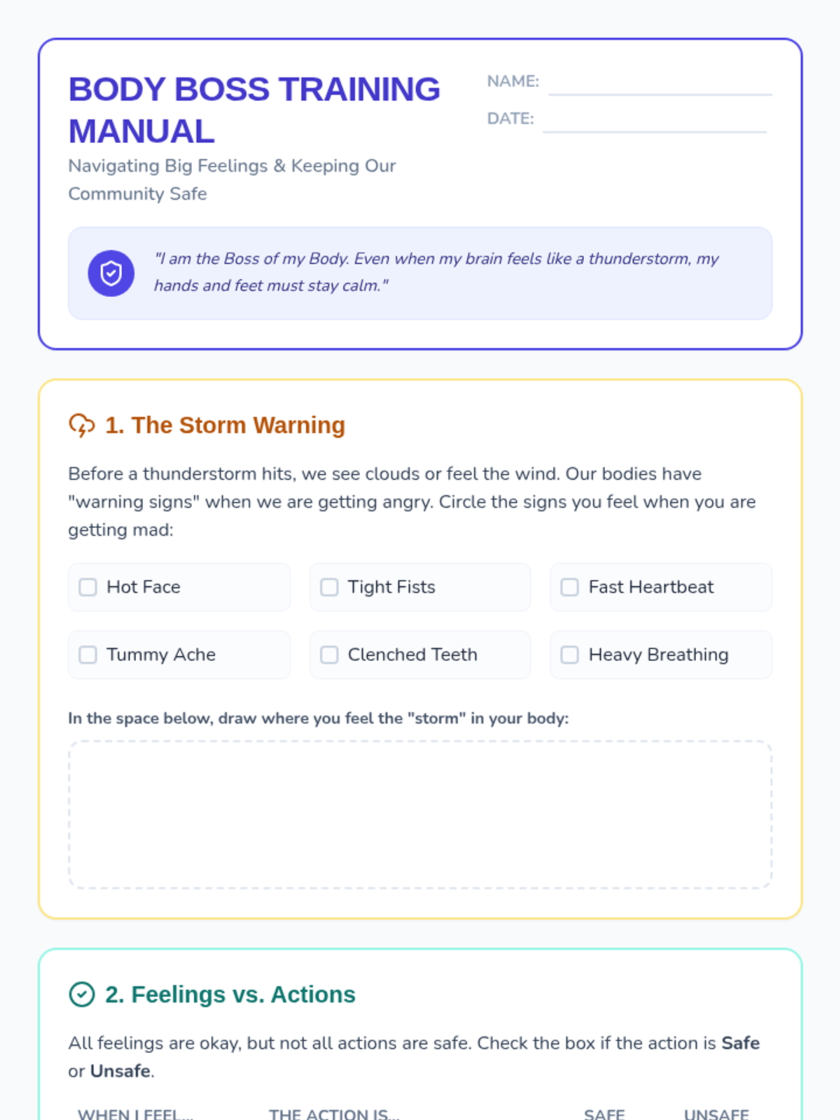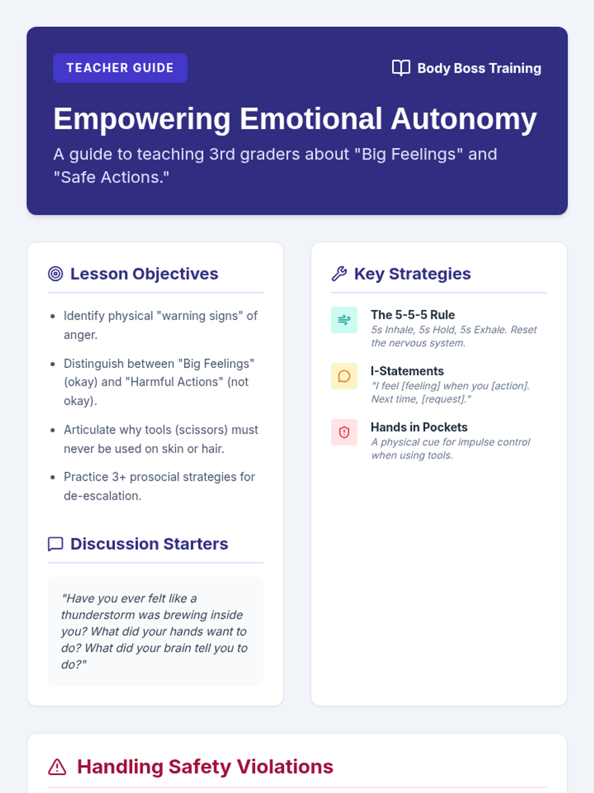 A comprehensive lesson for 3rd graders on emotional regulation, safety boundaries, and conflict resolution. Students learn to distinguish between 'Big Feelings' and 'Harmful Actions' while building a 'Success Strategy' toolkit.