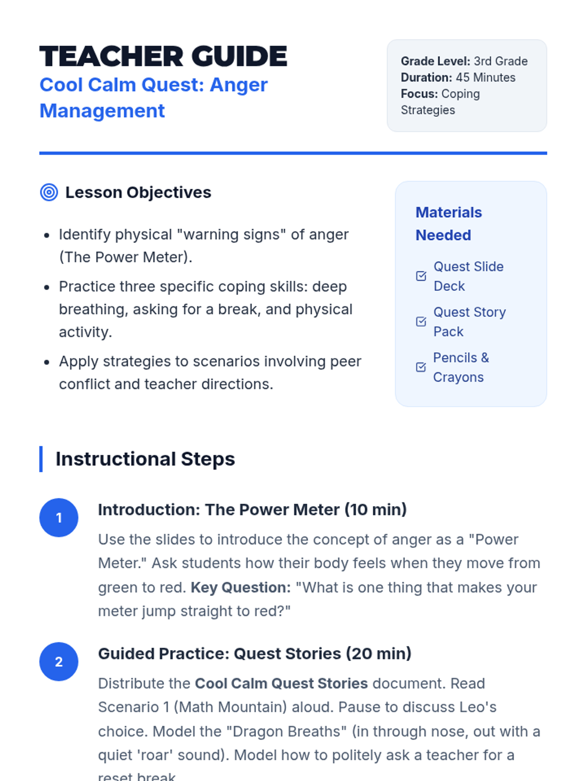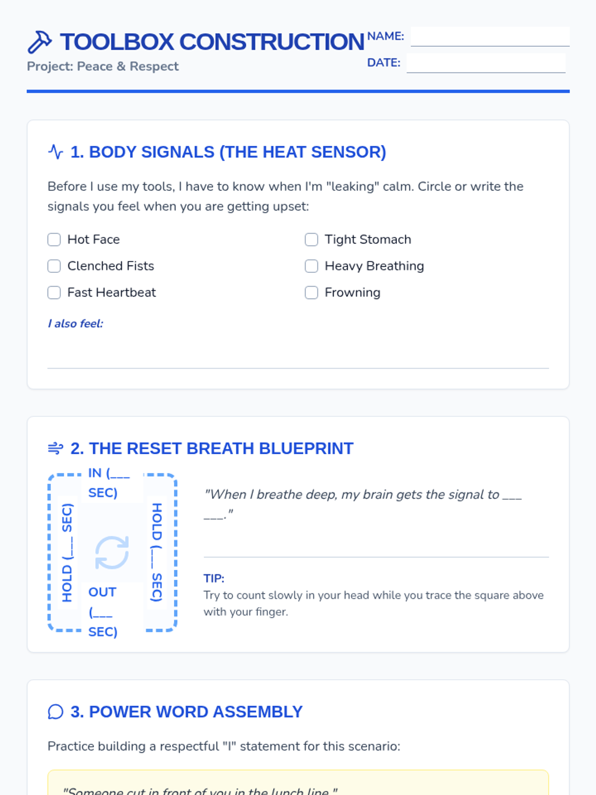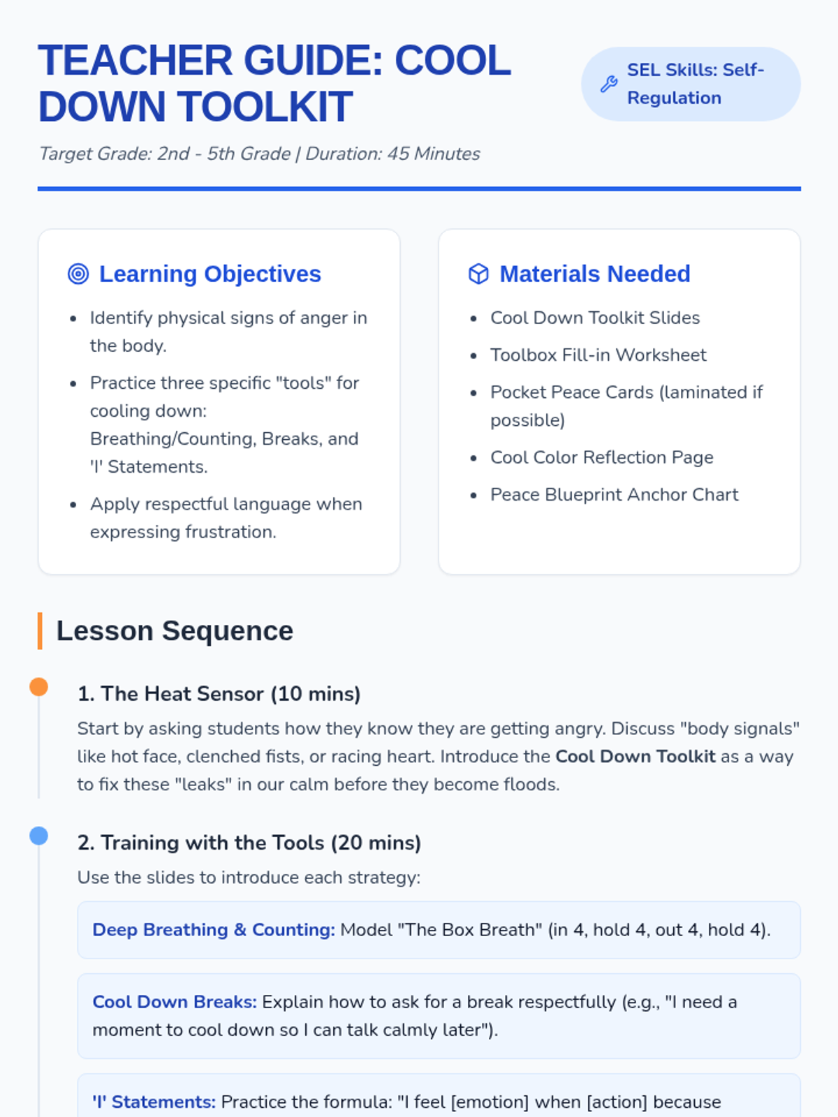 A comprehensive lesson on managing anger through respectful communication and self-regulation techniques. Students learn to use 'I' statements, practice deep breathing, and understand when to take a 'Cool Down' break.