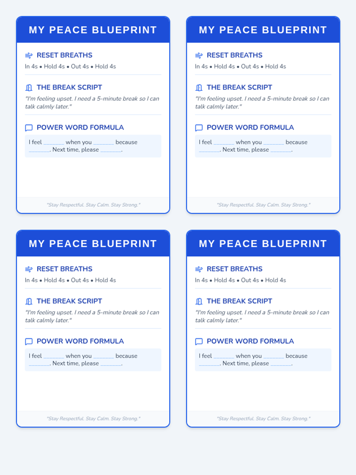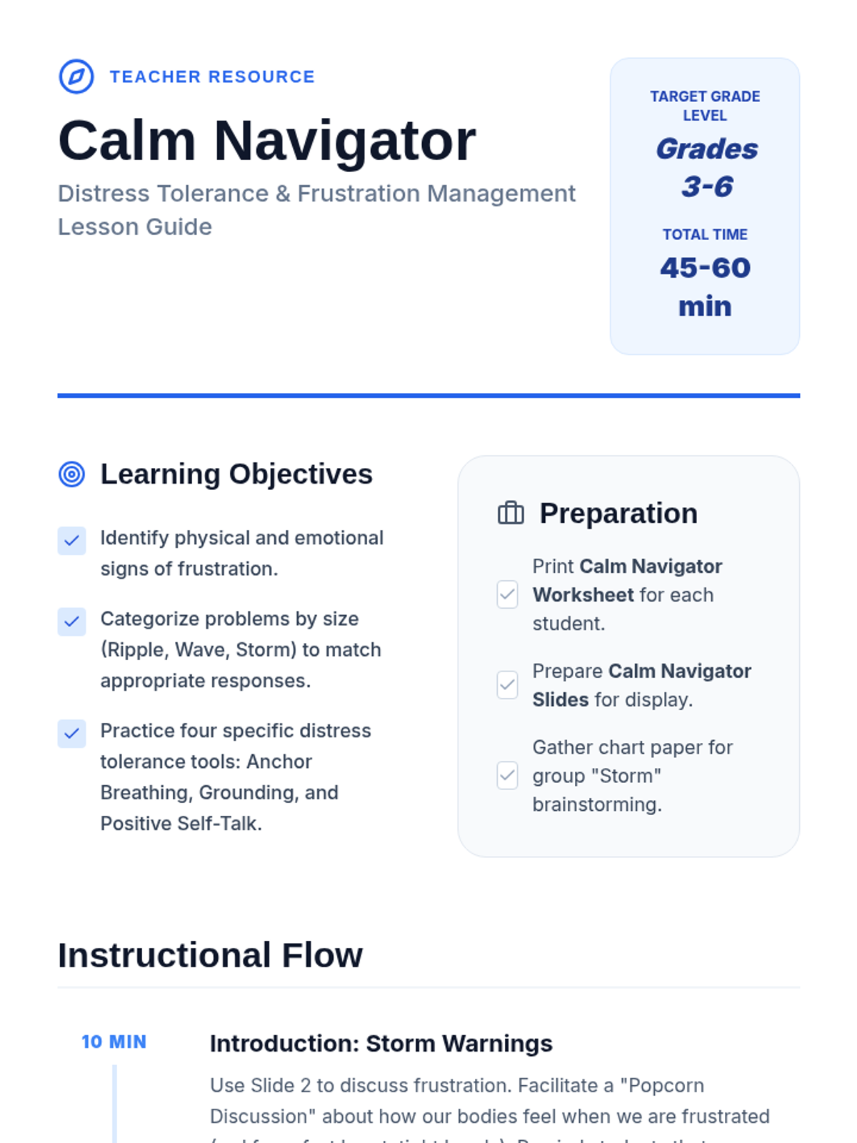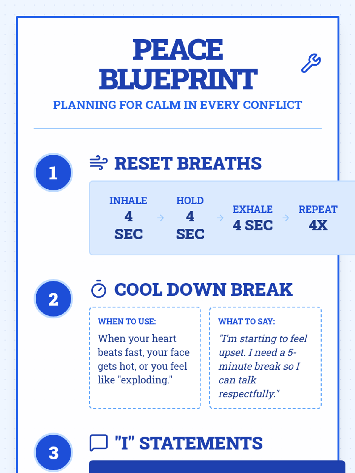 A comprehensive lesson on managing anger through respectful communication and self-regulation techniques. Students learn to use 'I' statements, practice deep breathing, and understand when to take a 'Cool Down' break.
