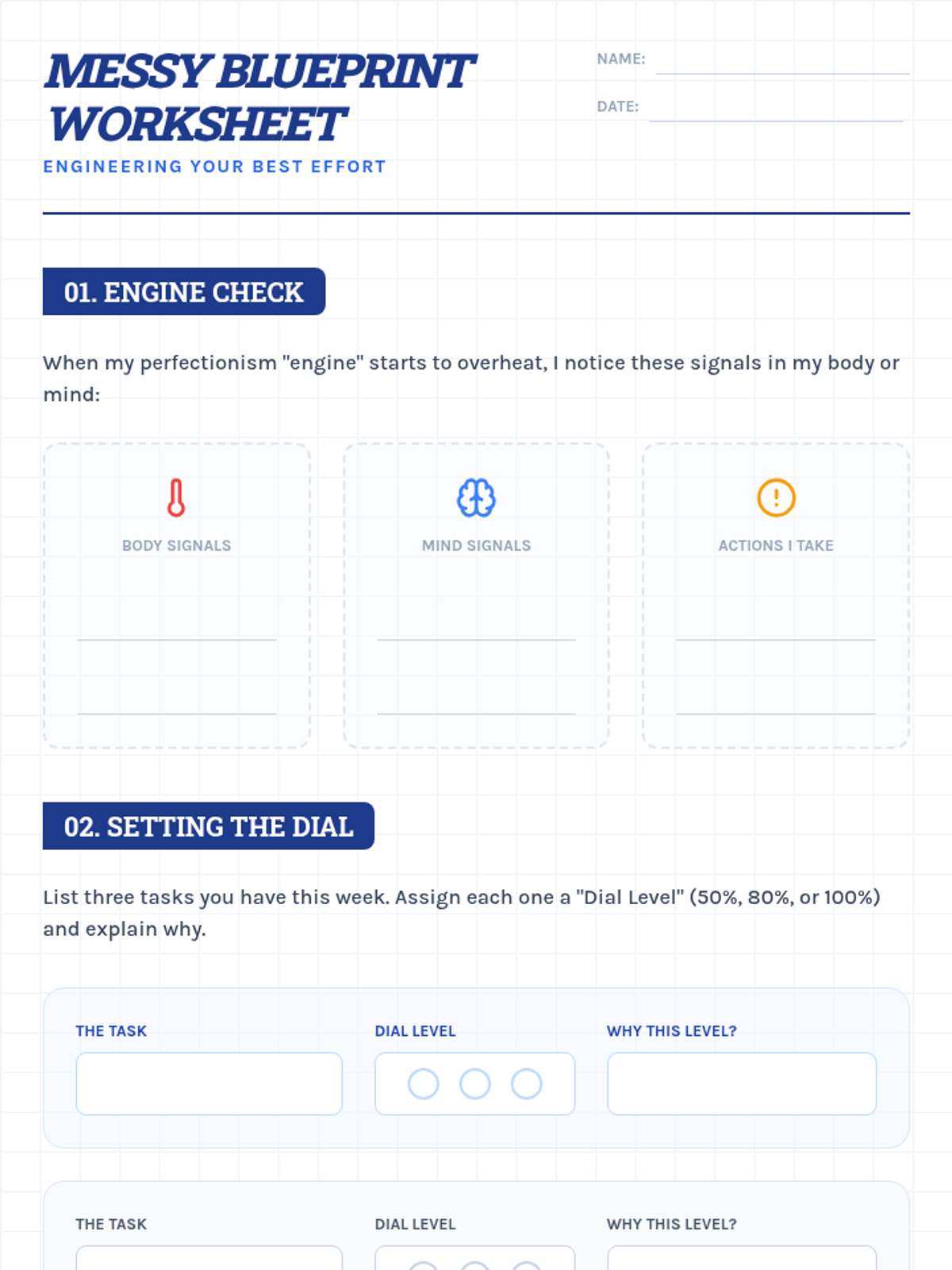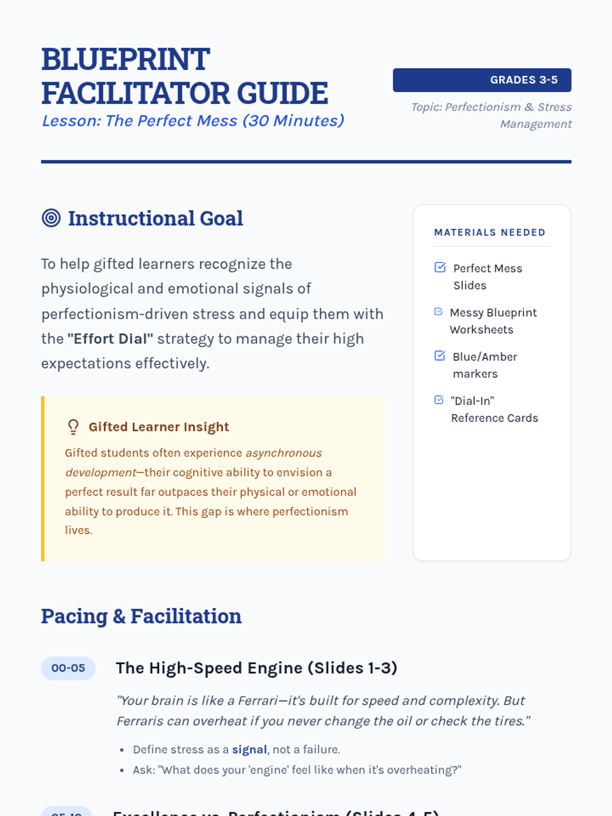 A 30-minute interactive lesson designed for gifted students in grades 3-5 to understand stress and manage perfectionism through the 'Blueprint' concept. Students explore the difference between excellence and perfection and practice reframing mistakes as necessary revisions.