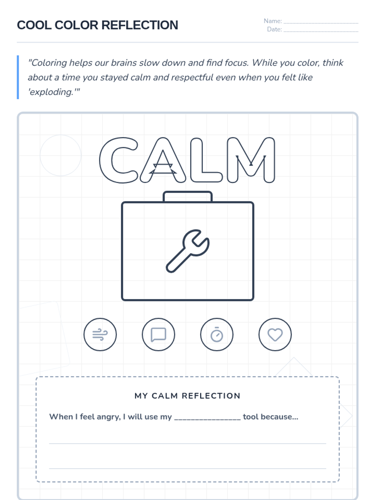 A hands-on lesson where students build a personal 'calming toolbox' filled with evidence-based strategies for breathing, grounding, and movement. Students learn to identify when they need a tool and how to use it effectively to manage their emotions.
