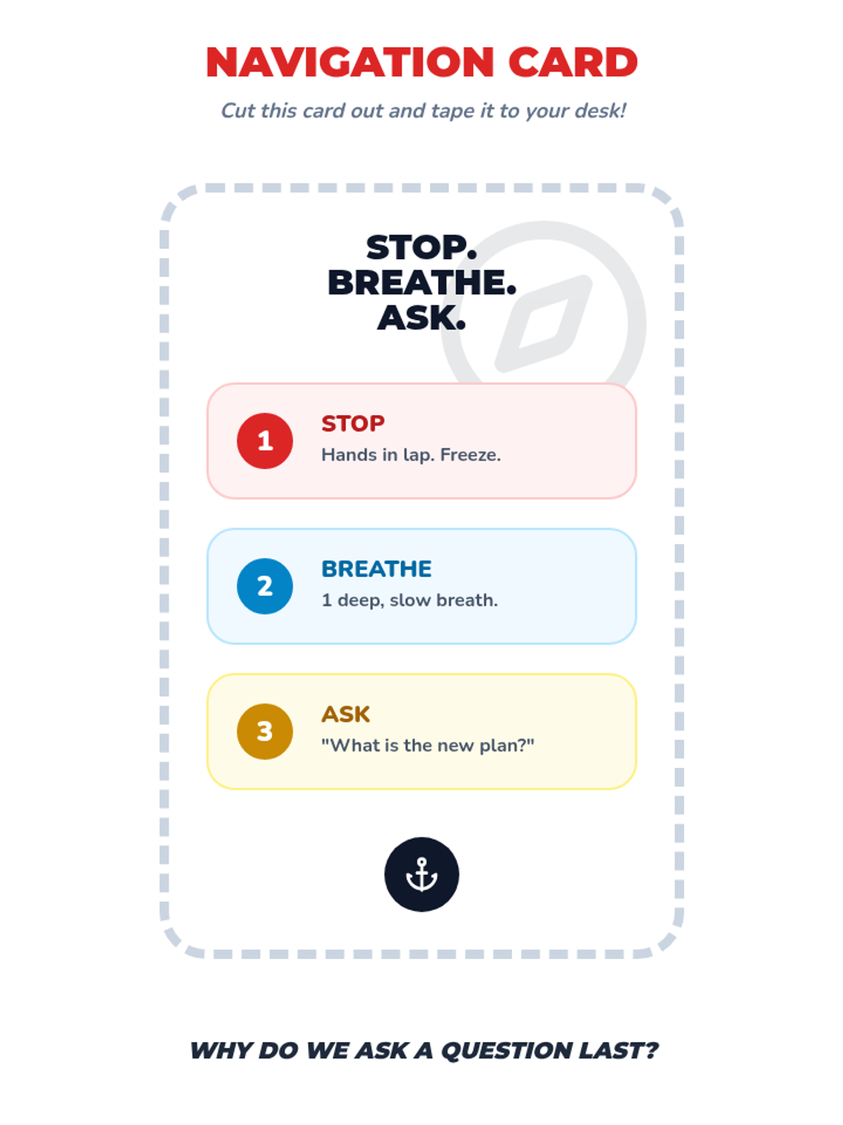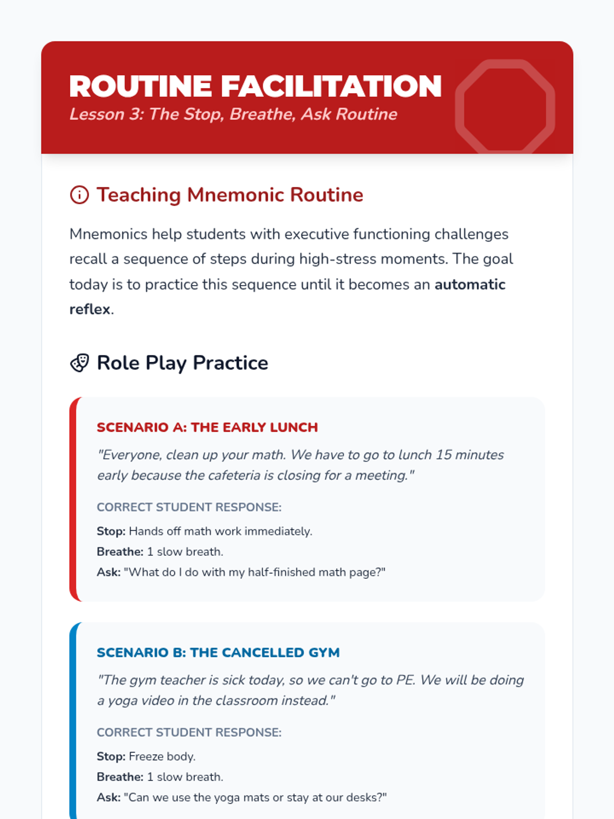 Students learn a three-step mnemonic routine (Stop, Breathe, Ask) to use when changes occur. Role-playing helps internalize the sequence of pausing, breathing, and clarifying the new plan.