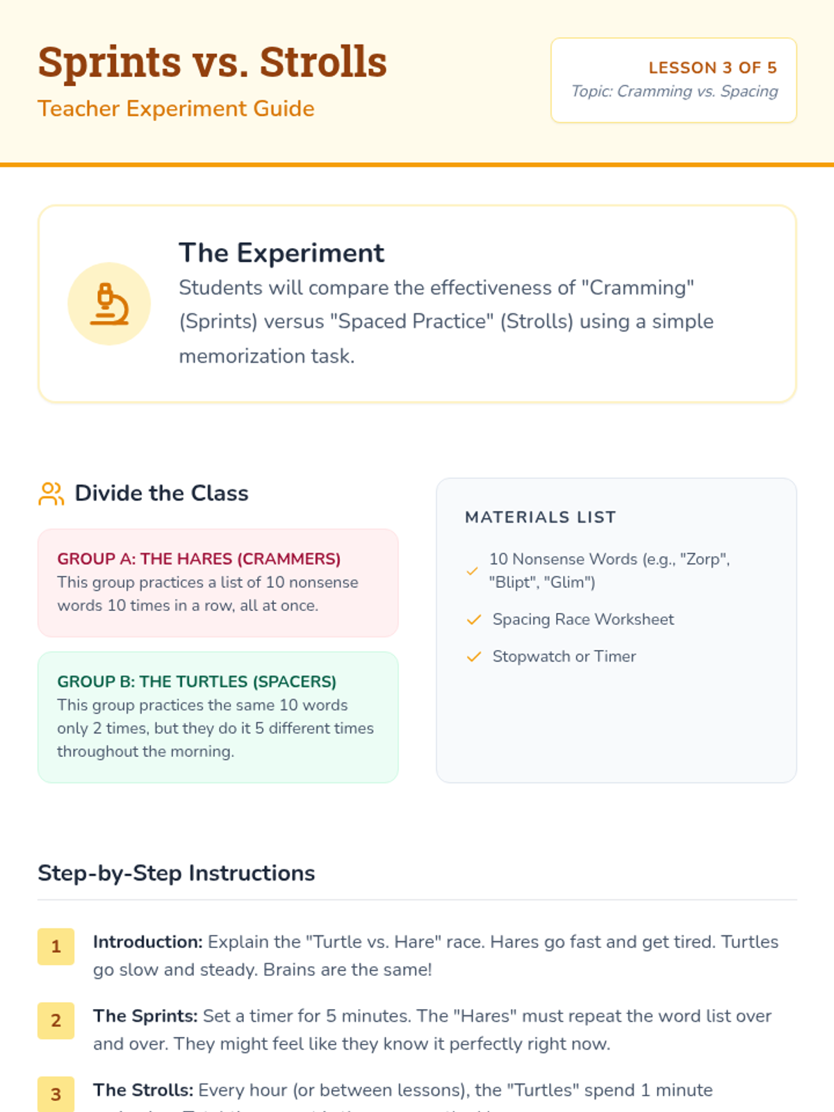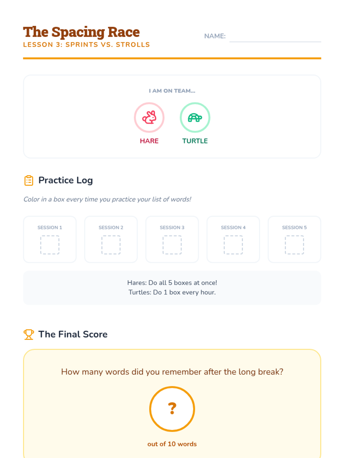 Students engage in an activity that compares 'cramming' (massed practice) vs. spacing. Half the class practices a skill all at once; the other half breaks it up. They compare results to validate their trackers.