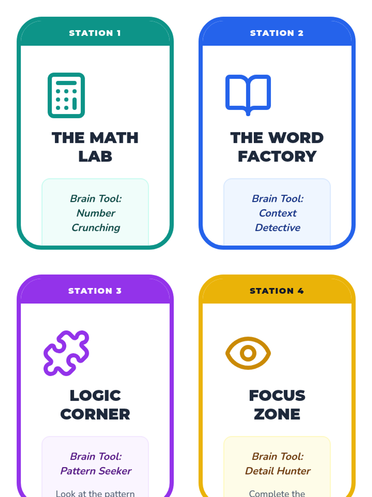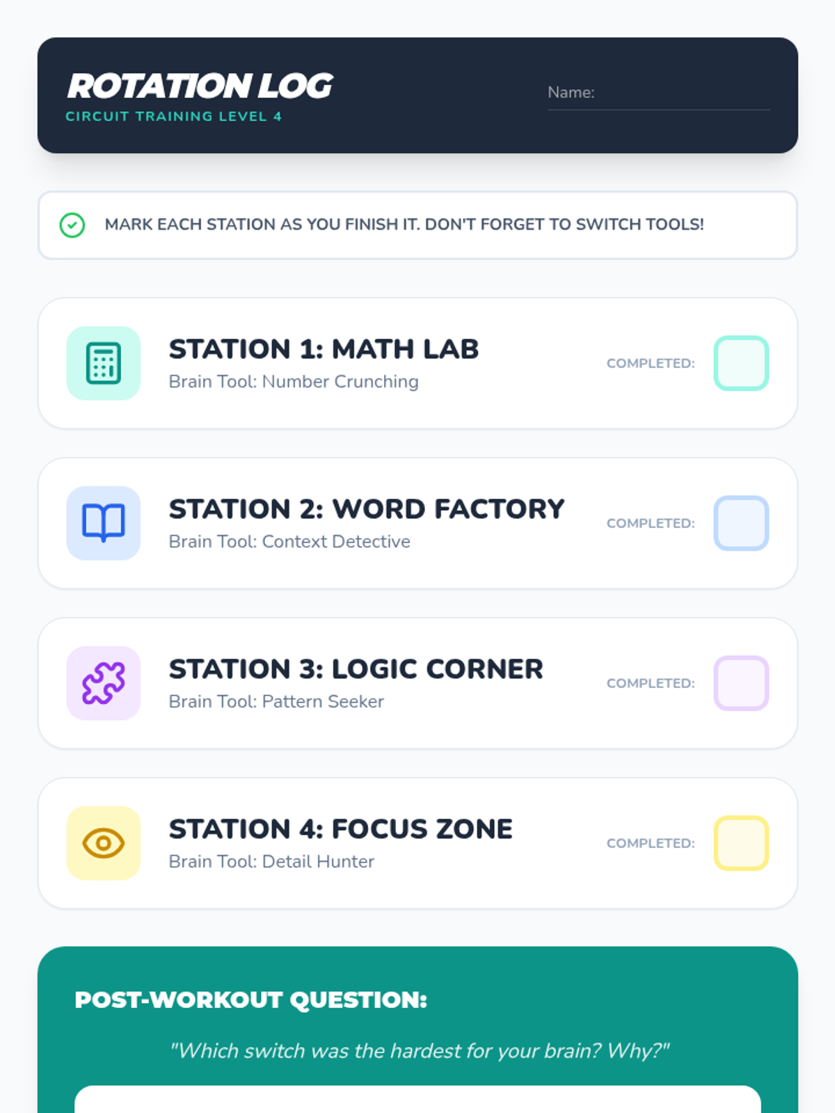 Students rotate through stations that require switching skills rapidly (e.g., a reading station, then a math station, then a logic puzzle) to simulate the mental flexibility required for interleaved spaced repetition.