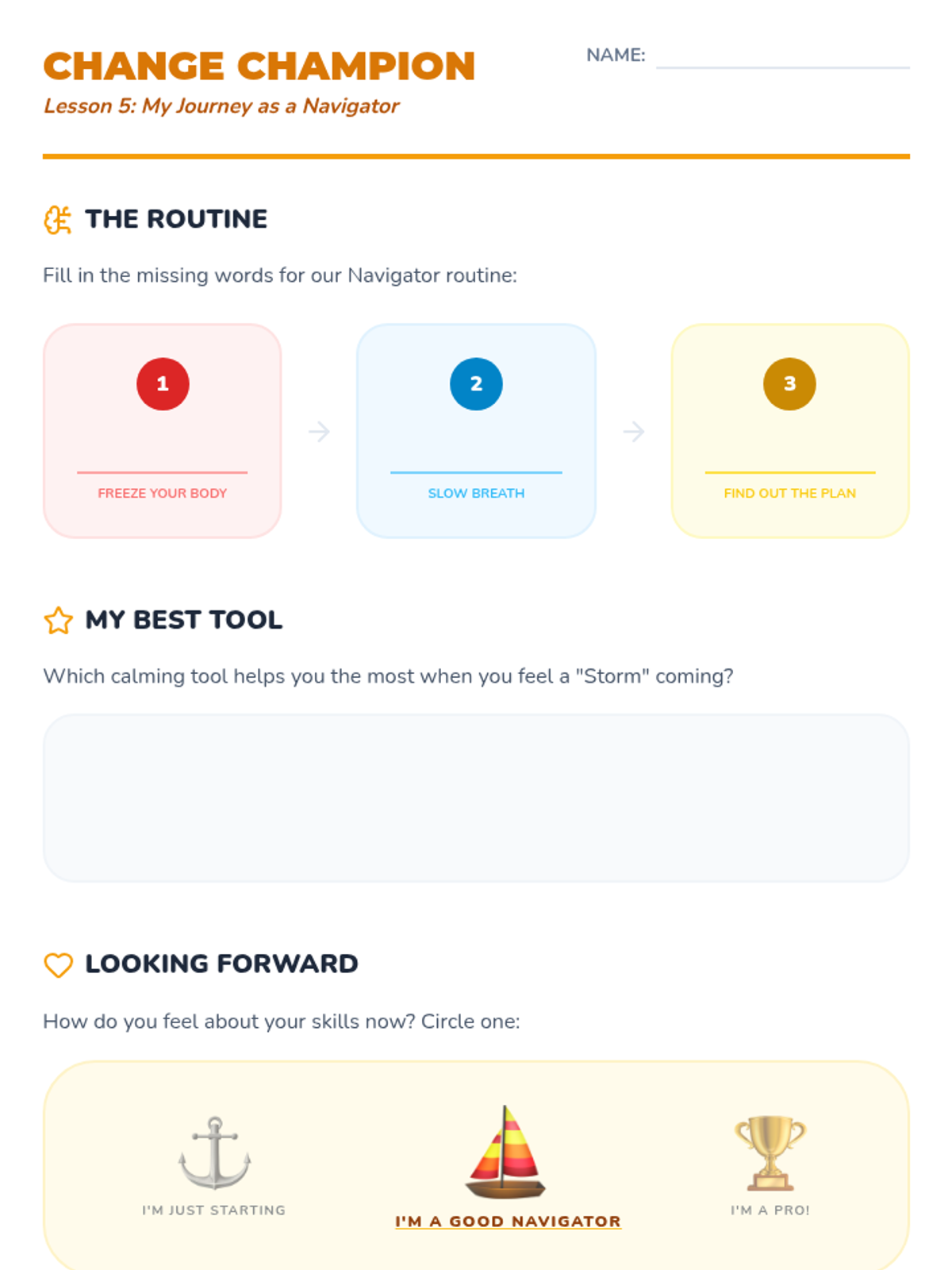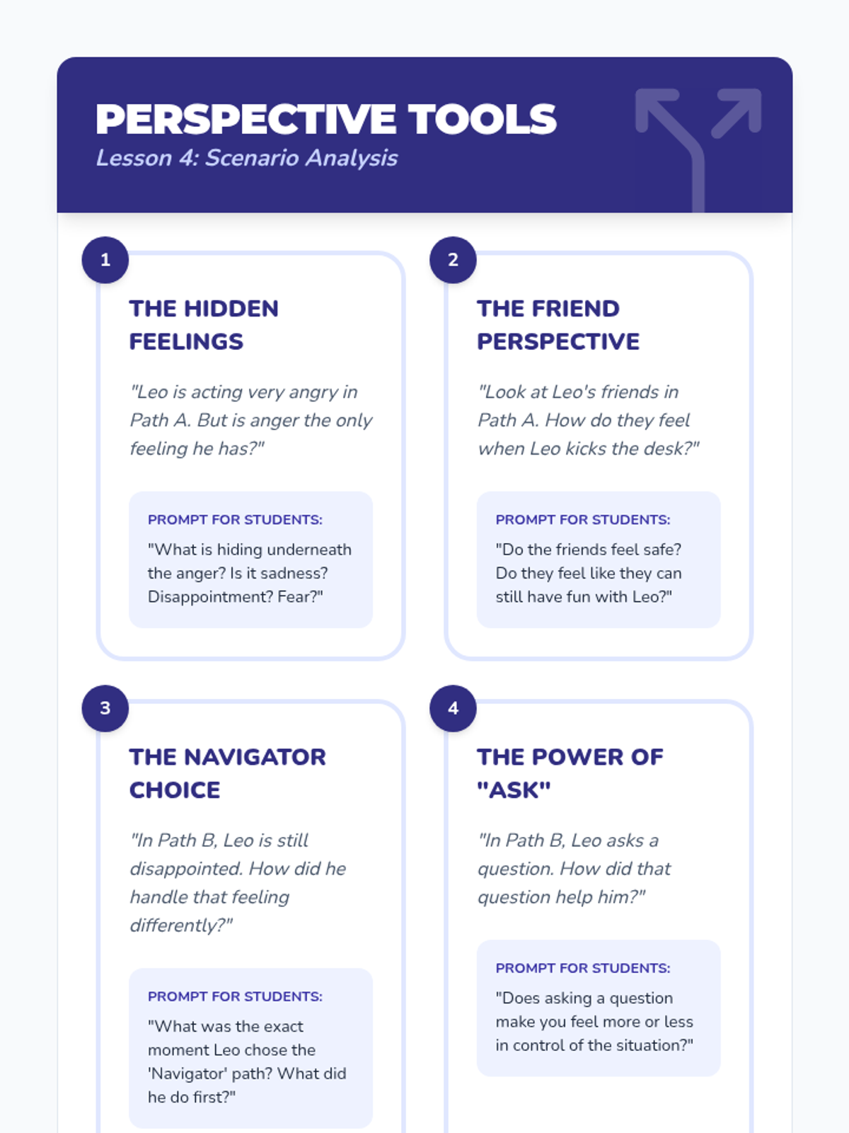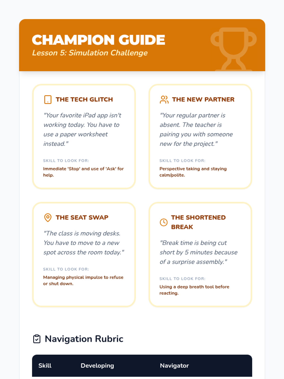 Students participate in simulations using 'Challenge Cards' to apply their coping skills and the 'Stop, Breathe, Ask' routine. Peer feedback reinforces positive adaptation strategies.