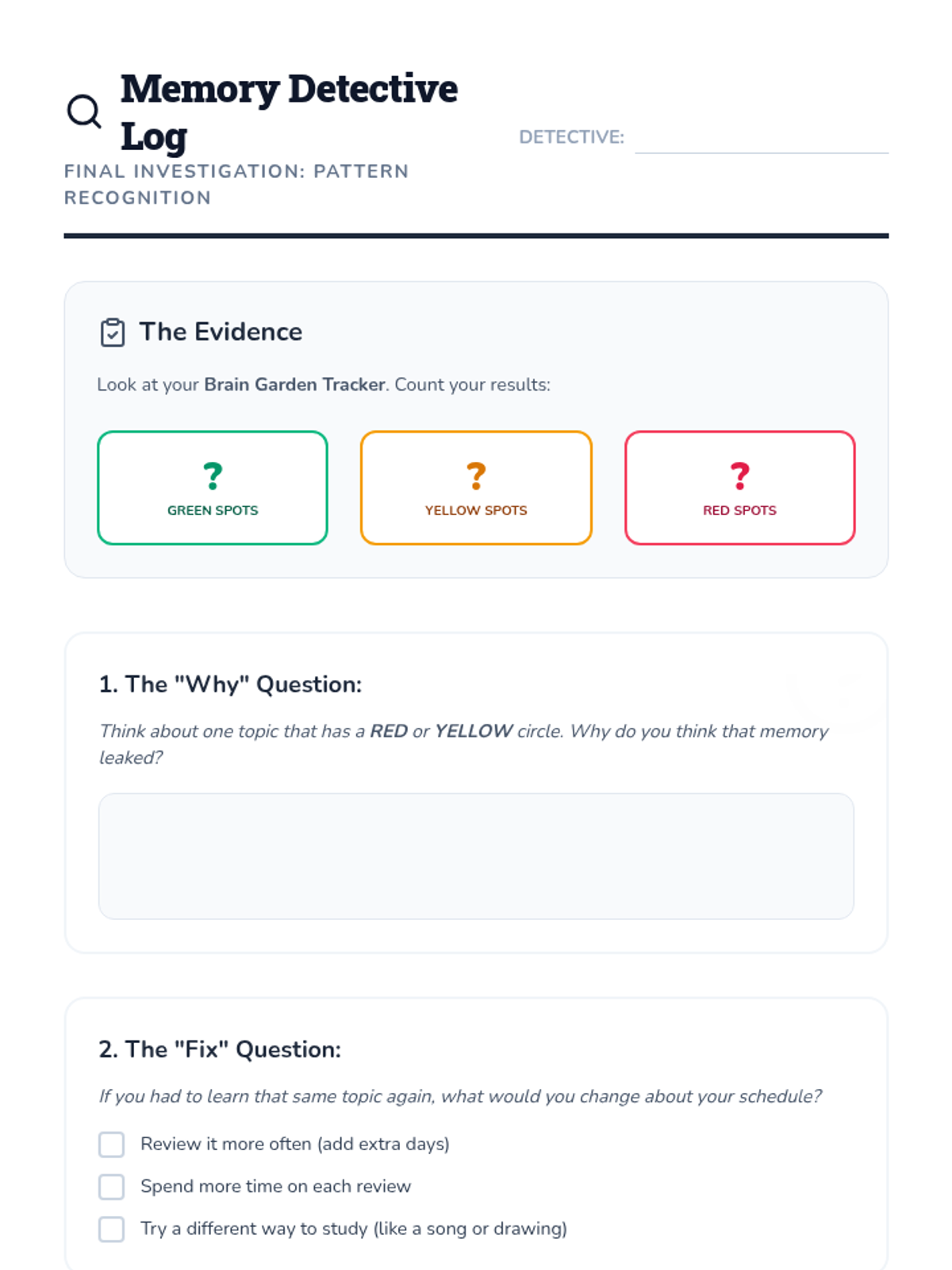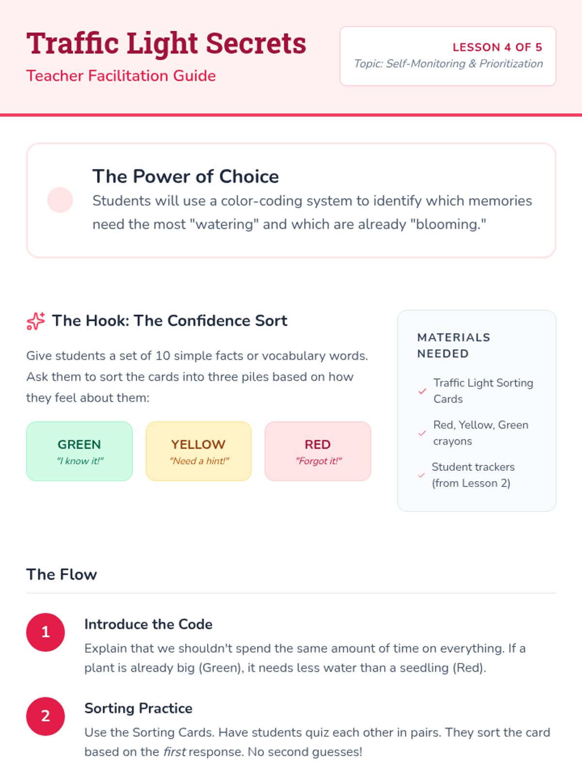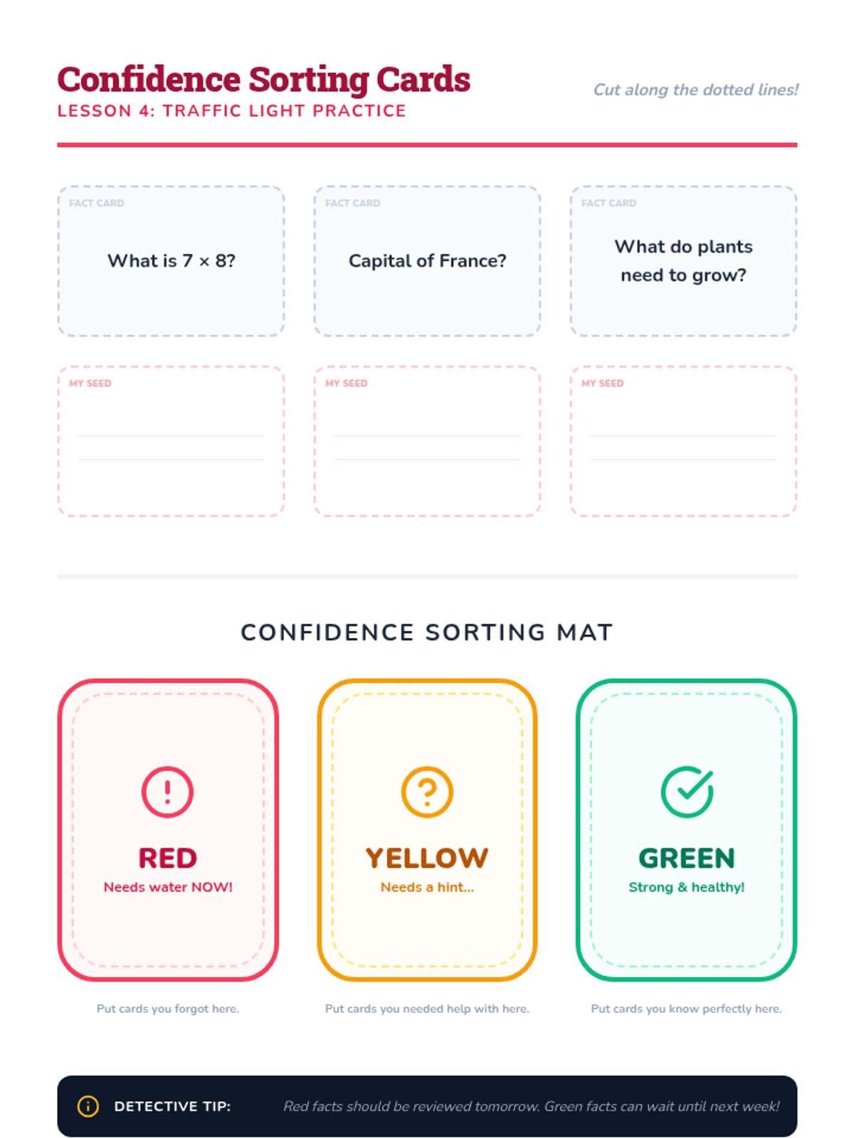Students learn to color-code their trackers (Green = I know it, Yellow = I need a hint, Red = I forgot). This helps them prioritize which items need immediate spaced repetition and which can wait.