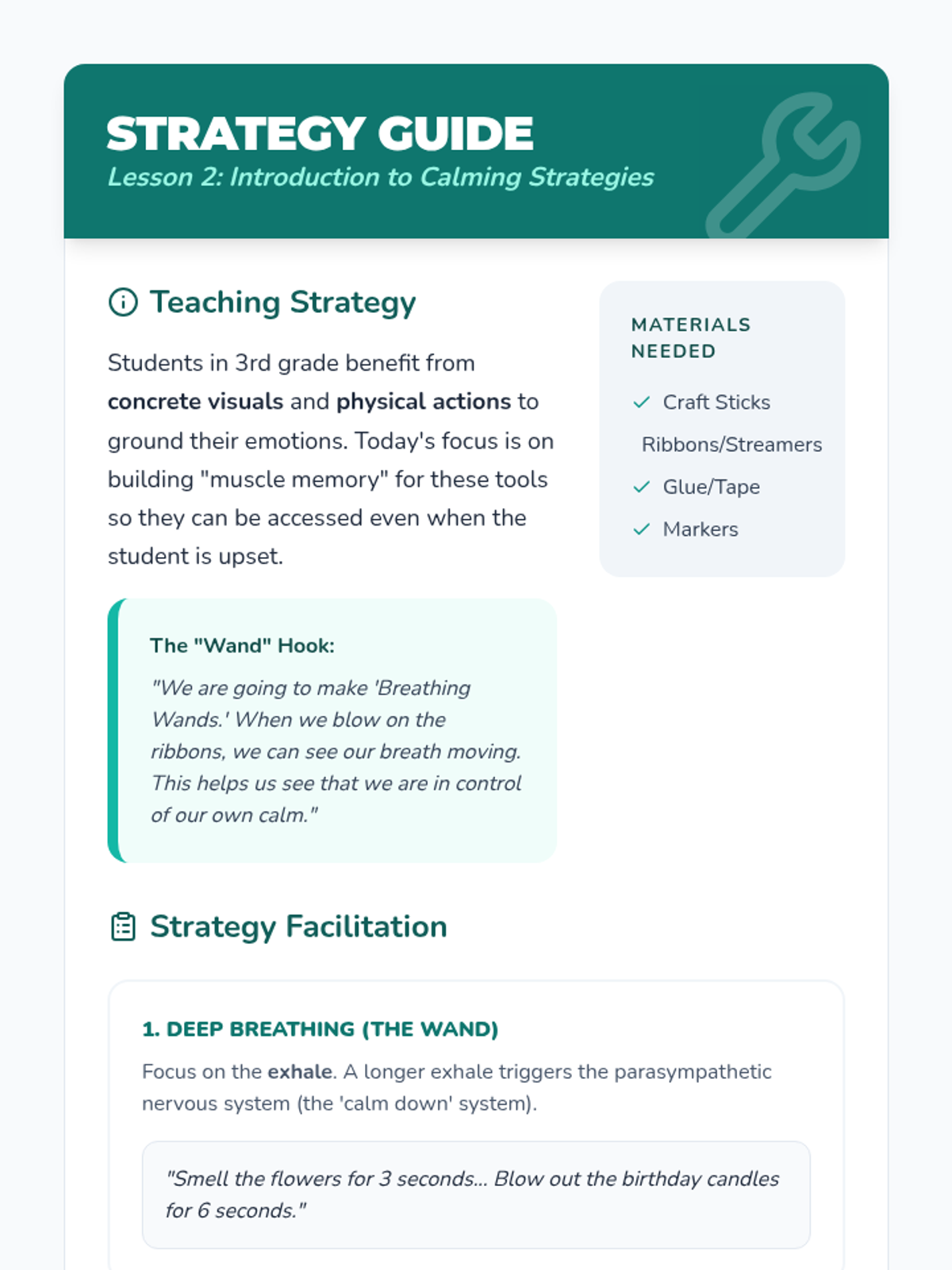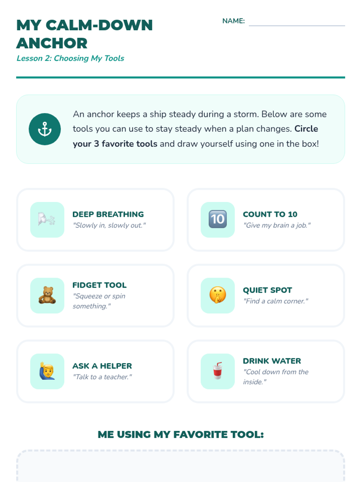 Introduces concrete coping mechanisms like deep breathing and counting to ten. Students build a 'toolbox' of strategies to access when they feel dysregulated.