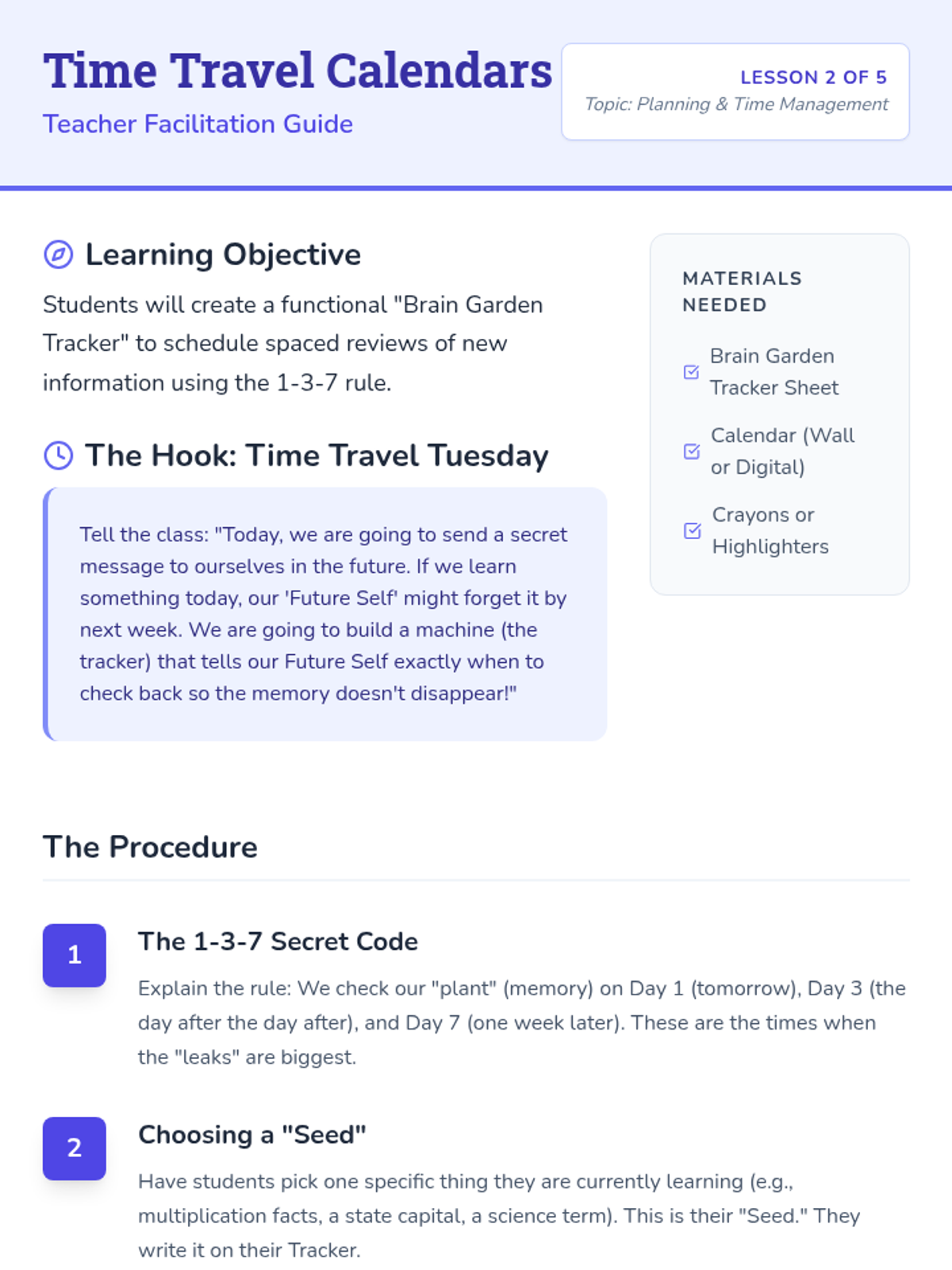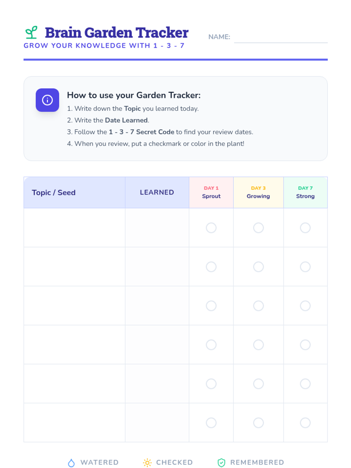 Students create a paper or digital 'Review Tracker' specifically for a content area like Social Studies. They learn to mark dates for the initial learning, 1-day check, 3-day check, and 1-week check.