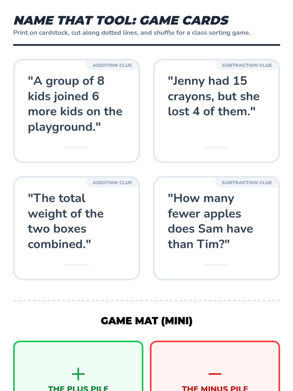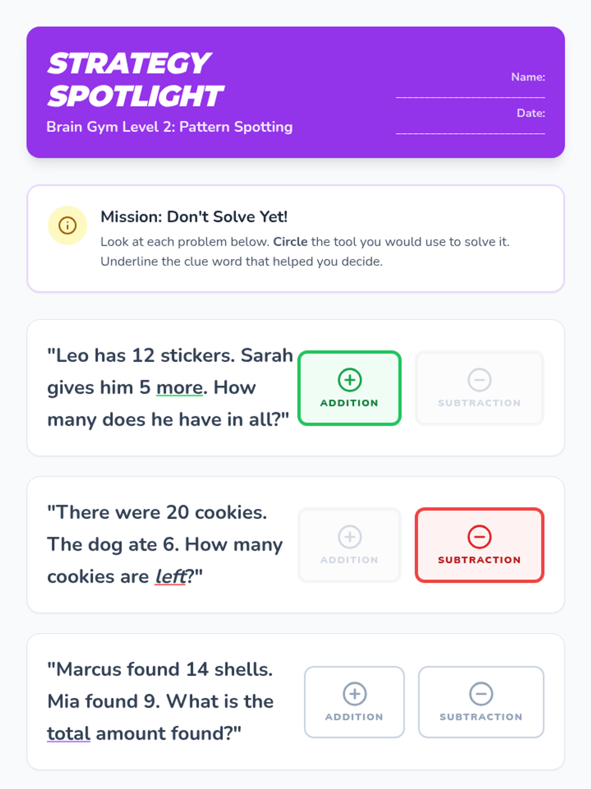 In a mixed review session, students practice identifying what strategy is needed before solving. They label problems (e.g., 'Addition' vs 'Subtraction') without solving them yet.