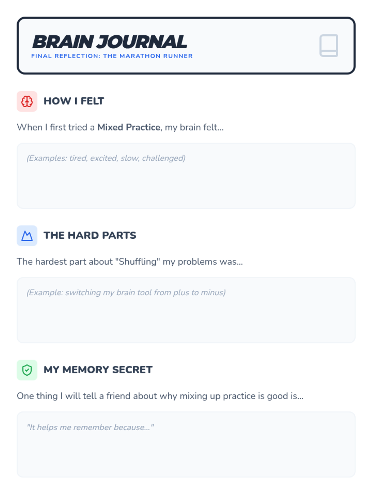 Students discuss how mixing up topics makes the brain work harder but keeps it more alert. They set goals for including one 'mixed review' session in their weekly routine.