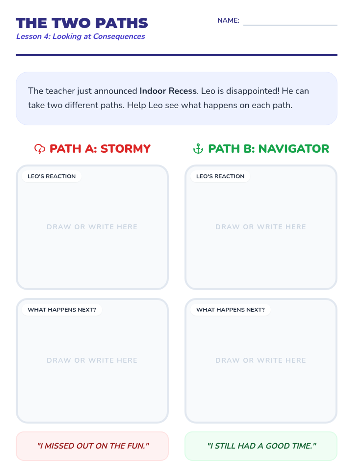 Using the 'Rainy Recess' scenario, students analyze different reactions to plan changes. They map out the consequences of various responses to build perspective-taking skills.