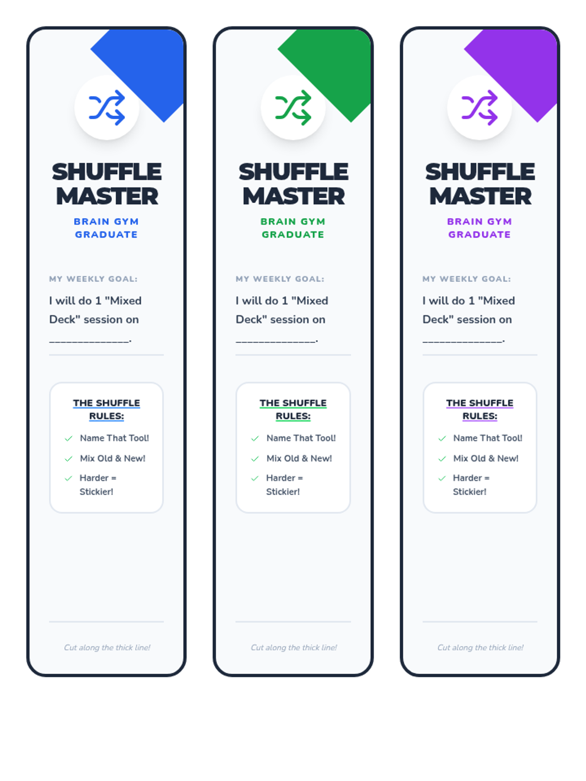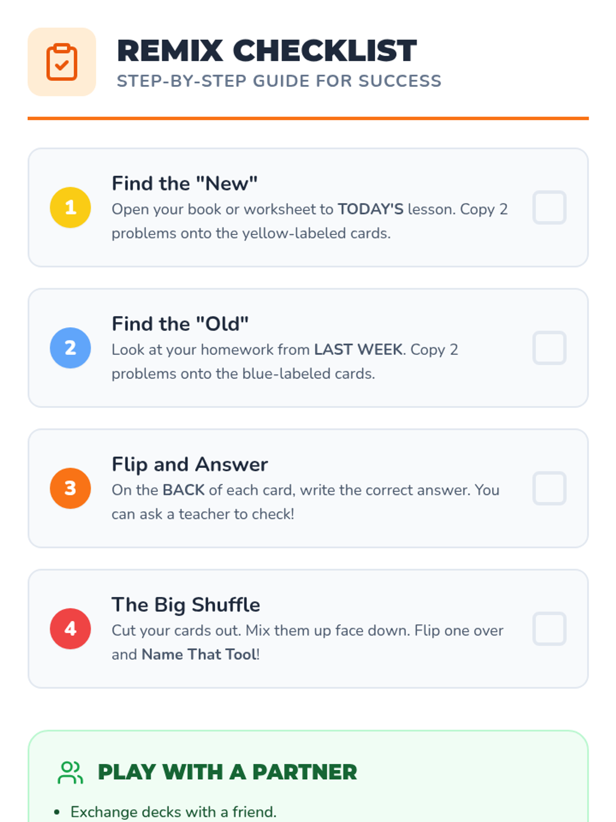 Students cut up old worksheets or homework assignments to create their own 'mixed decks.' They shuffle questions from last week with questions from this week to create a spaced and interleaved review deck.