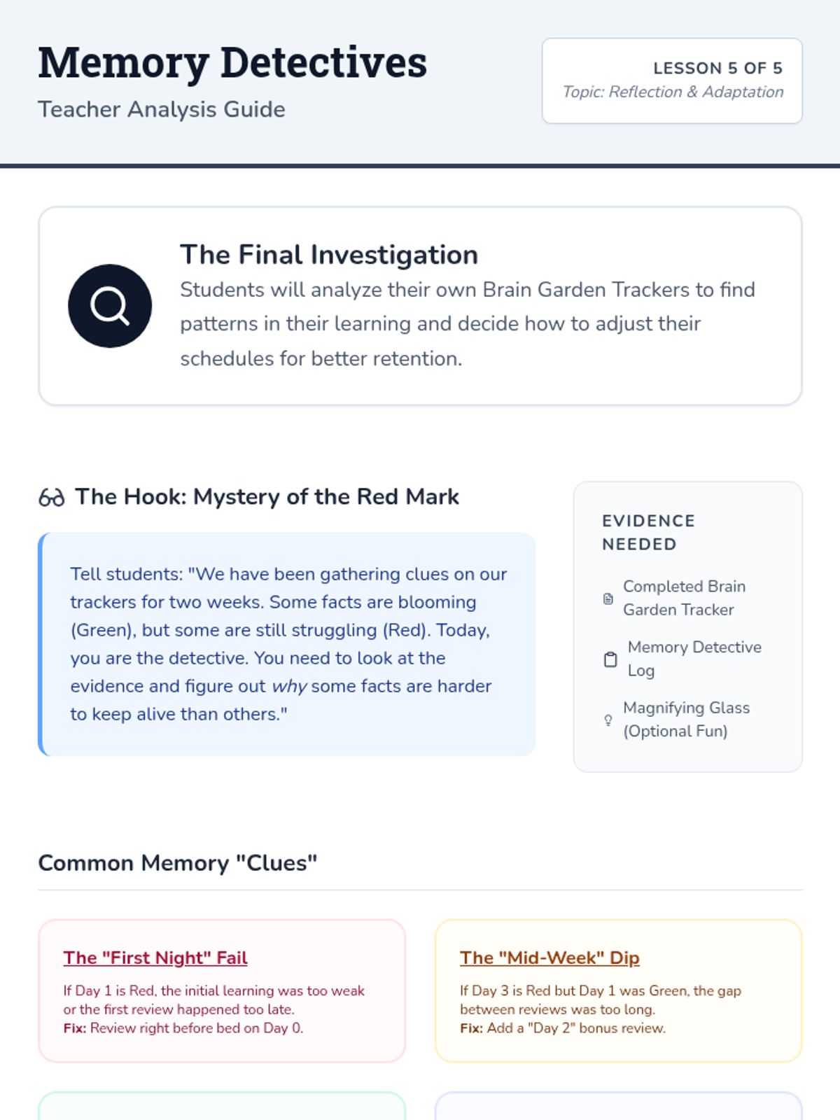 Students analyze their trackers after two weeks. They identify patterns in their memory retention and adjust their future spacing intervals (e.g., needing to review 'Red' items sooner).