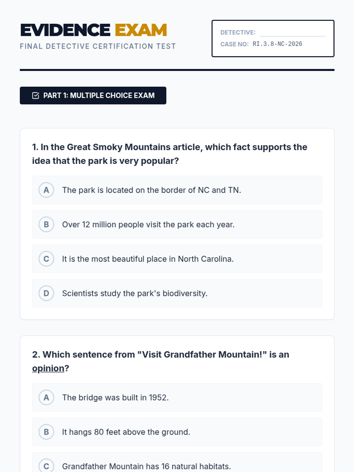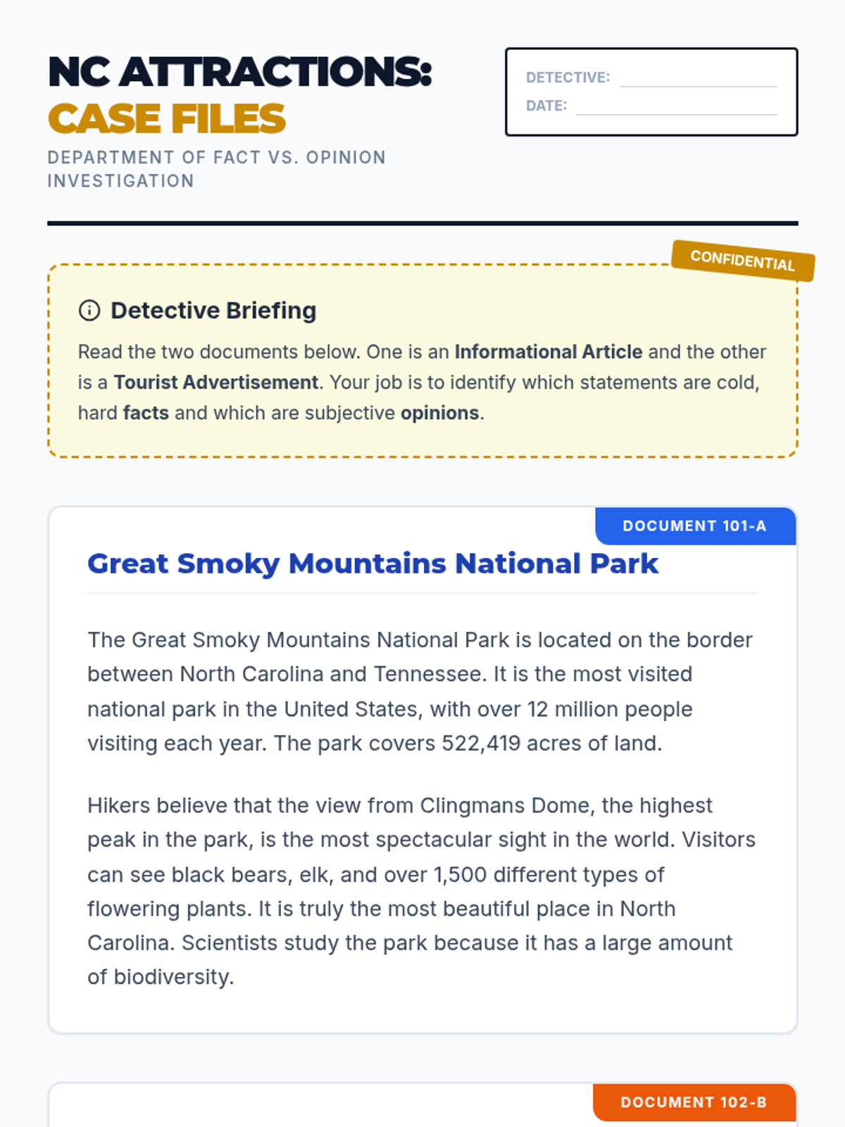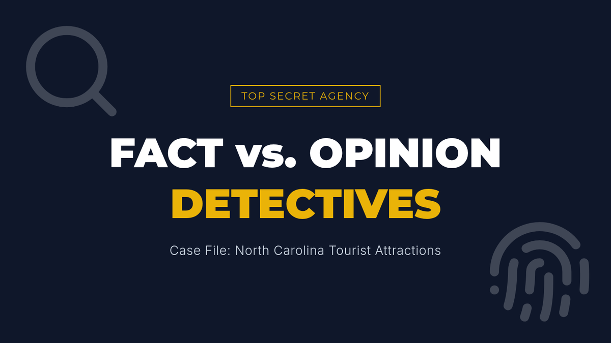 In this lesson, Grade 3 students become 'Fact Detectives' to distinguish between objective facts and subjective opinions in informational texts and advertisements about North Carolina landmarks. They will practice identifying clue words and supporting claims with evidence, aligning with NCSCOS RI.3.8.