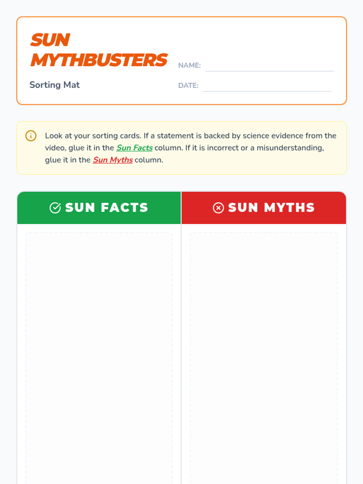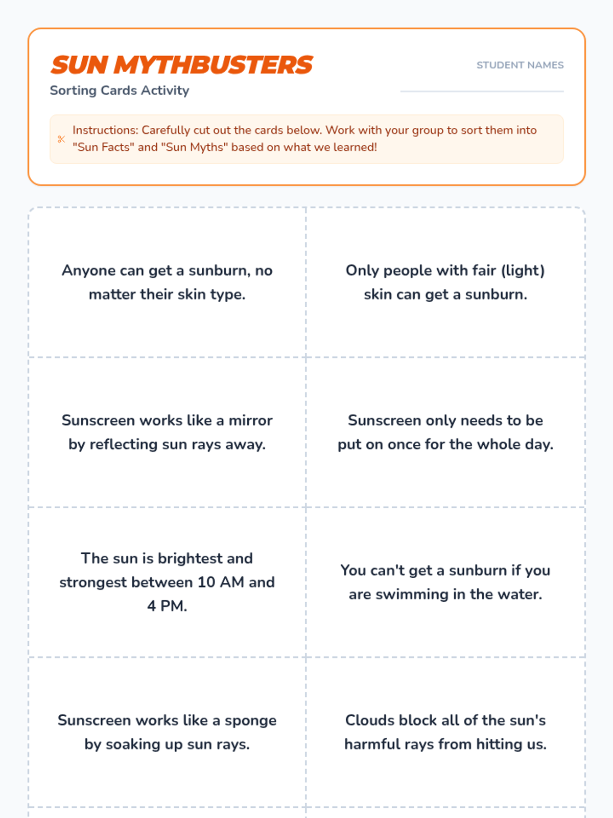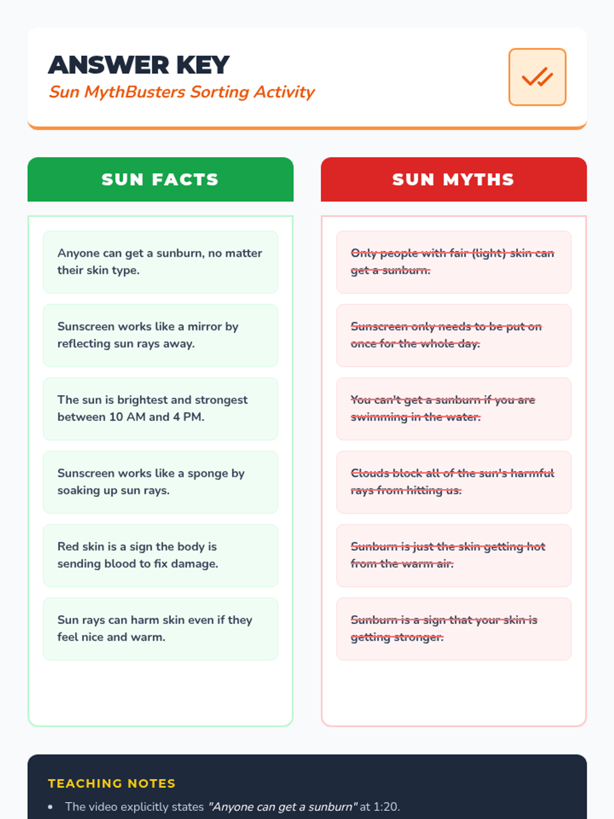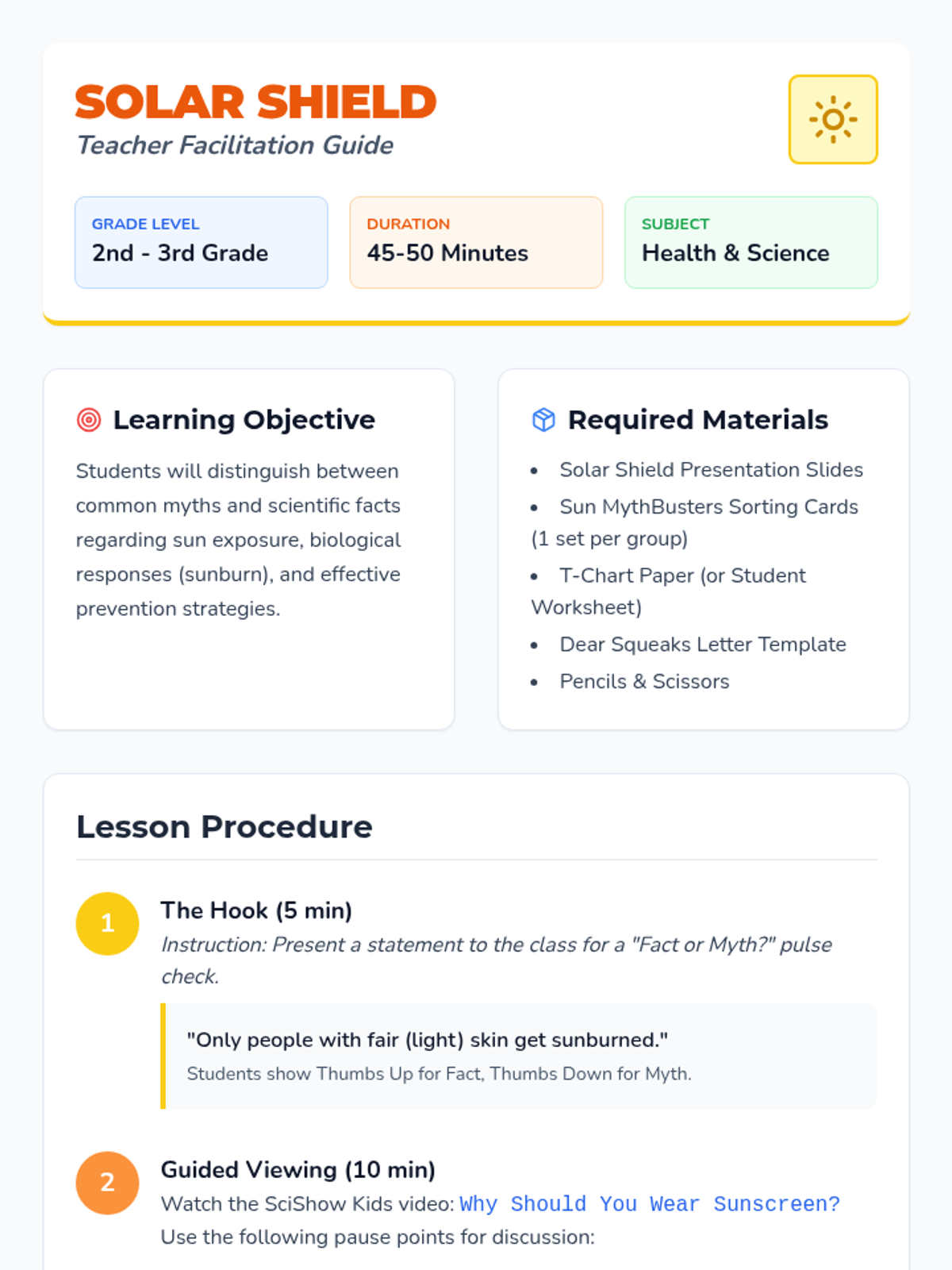 A sun safety lesson where students investigate myths and facts about sun exposure, explore the biology of sunburns, and learn prevention strategies through a SciShow Kids video and sorting activity.