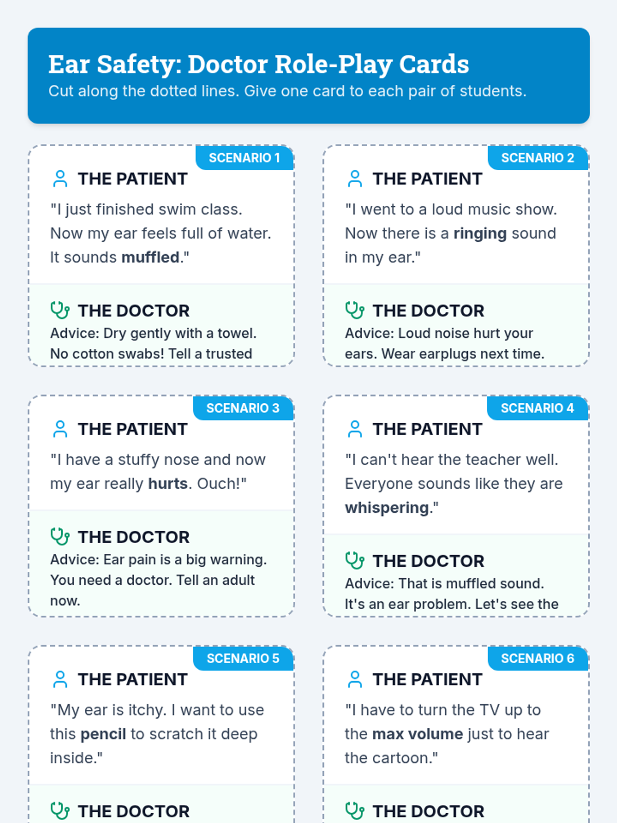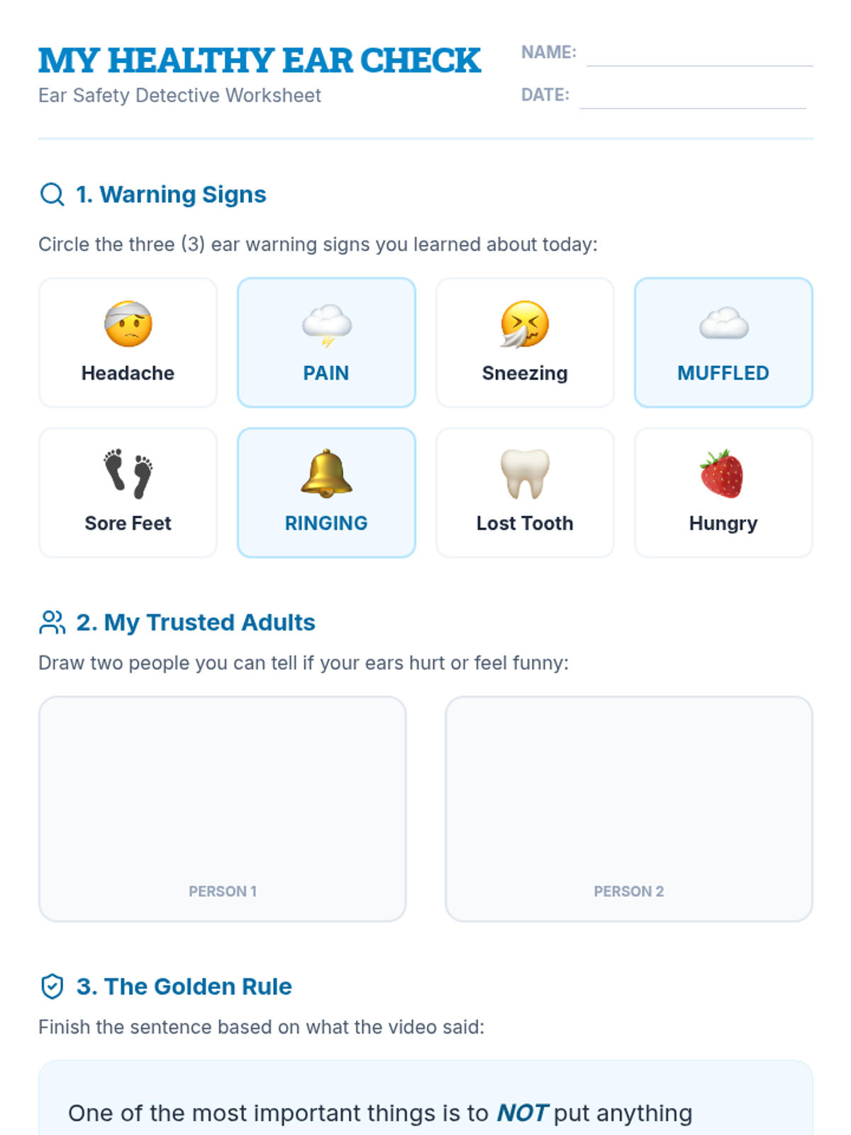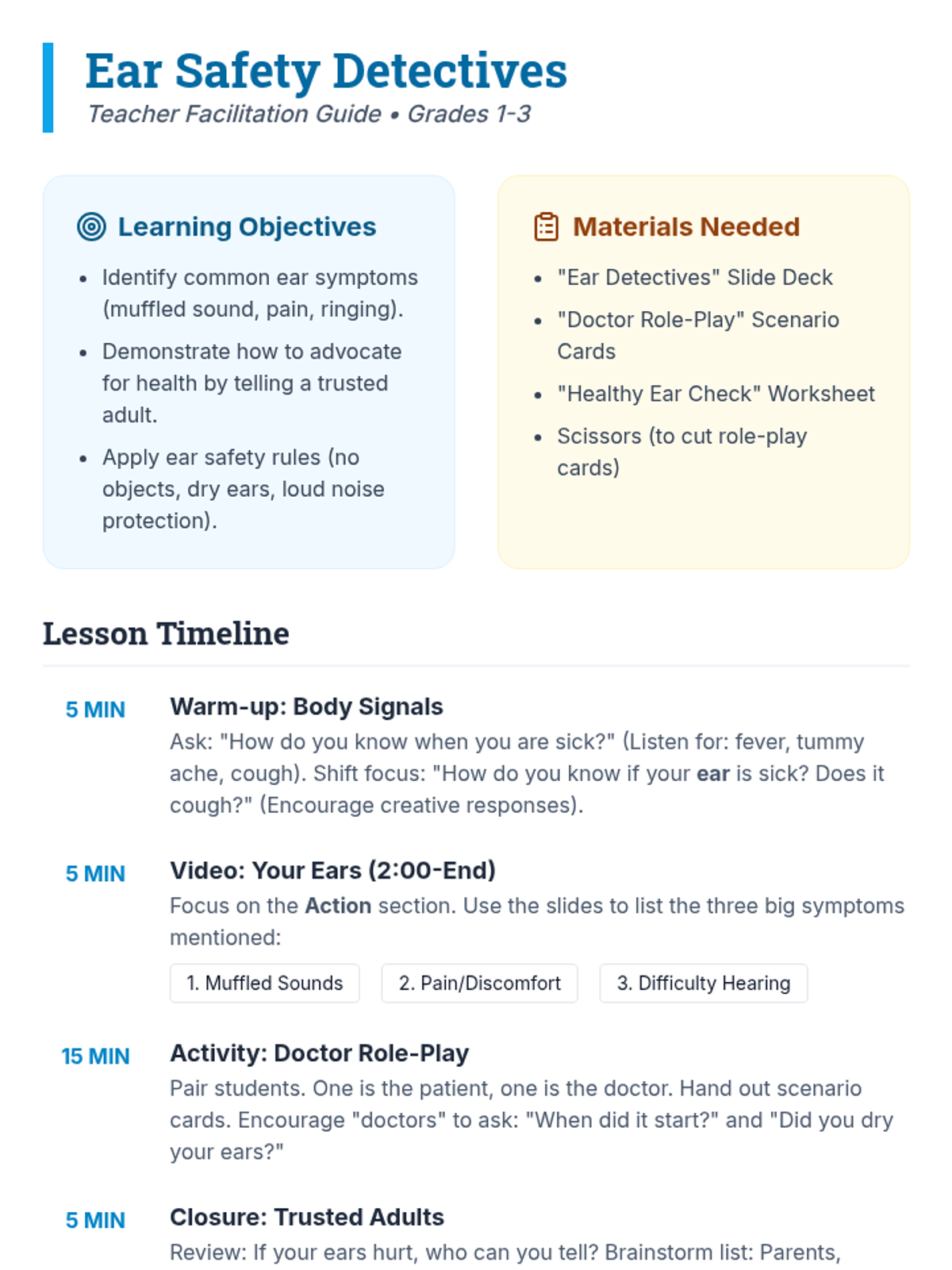 A 1st-3rd grade health lesson teaching students to recognize ear problems, advocate for their hearing health, and identify symptoms like muffled sound or pain. includes a video analysis, doctor-patient role-play, and trusted adult identification.