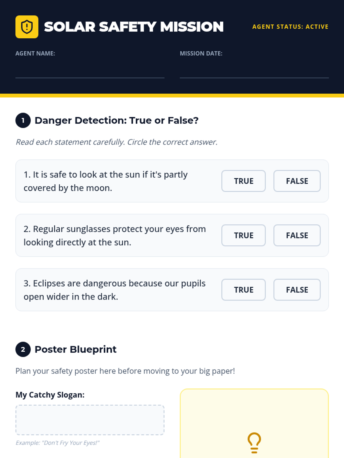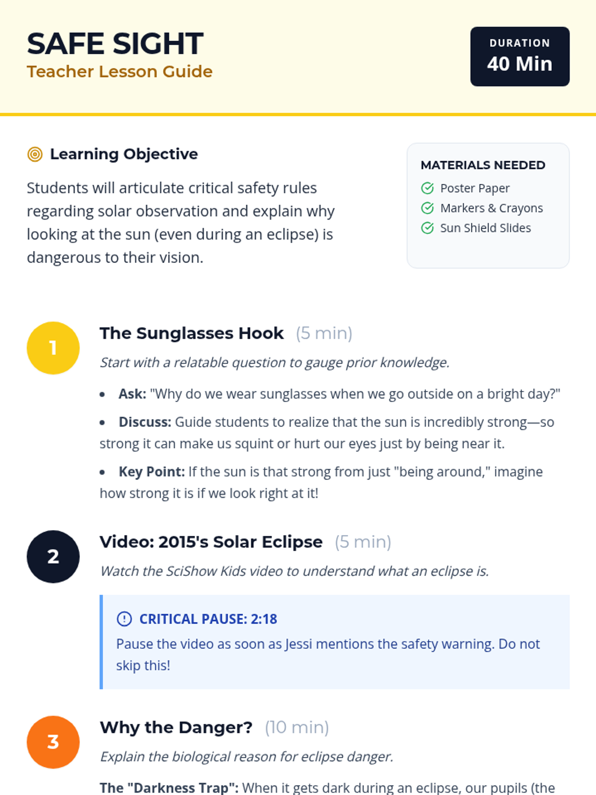 A safety-focused lesson for elementary students on how to observe solar events safely, centered around a 2015 solar eclipse video. Students learn why looking at the sun is dangerous and create safety posters to warn others.