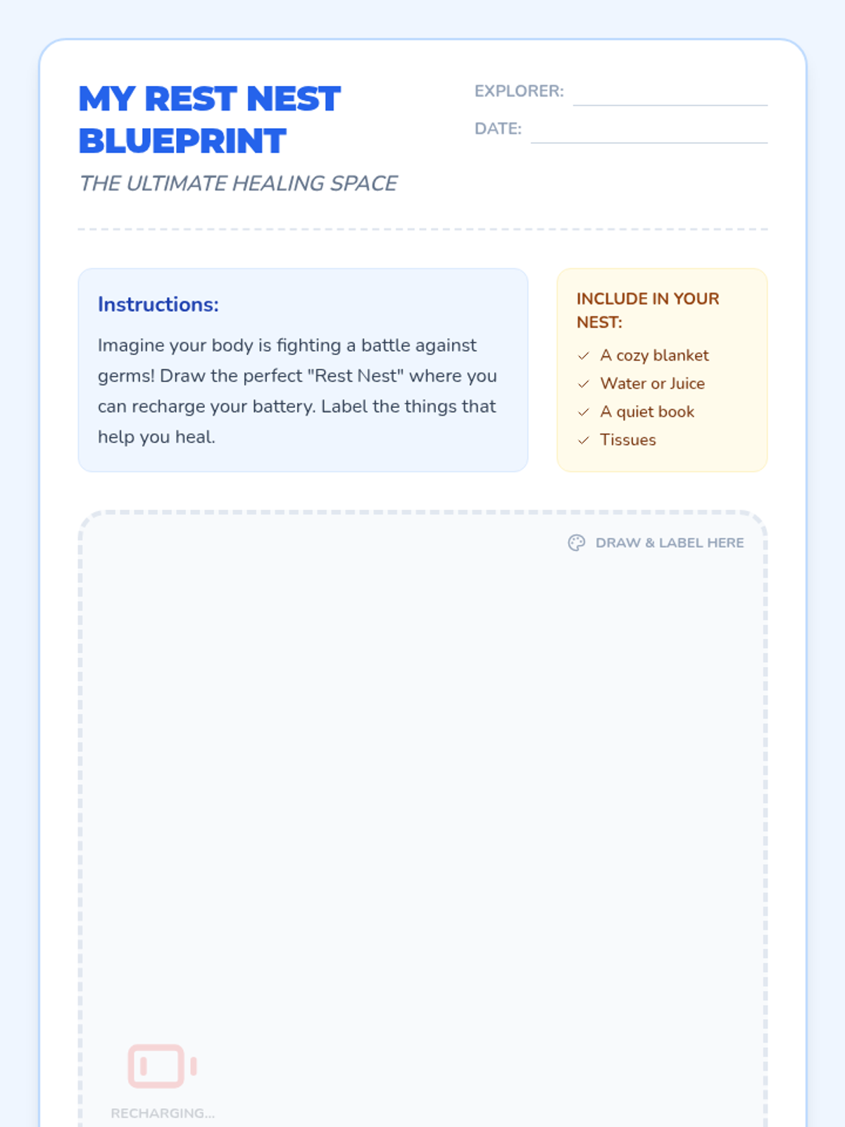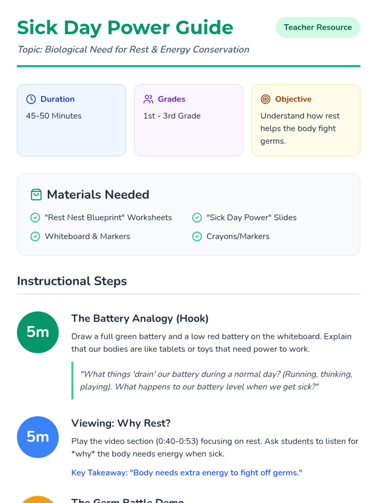 A lesson for 1st-3rd grade students on why the body needs rest to fight illness, featuring the 'Battery Analogy' and a creative design activity.