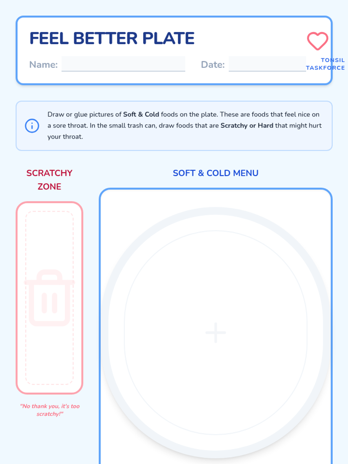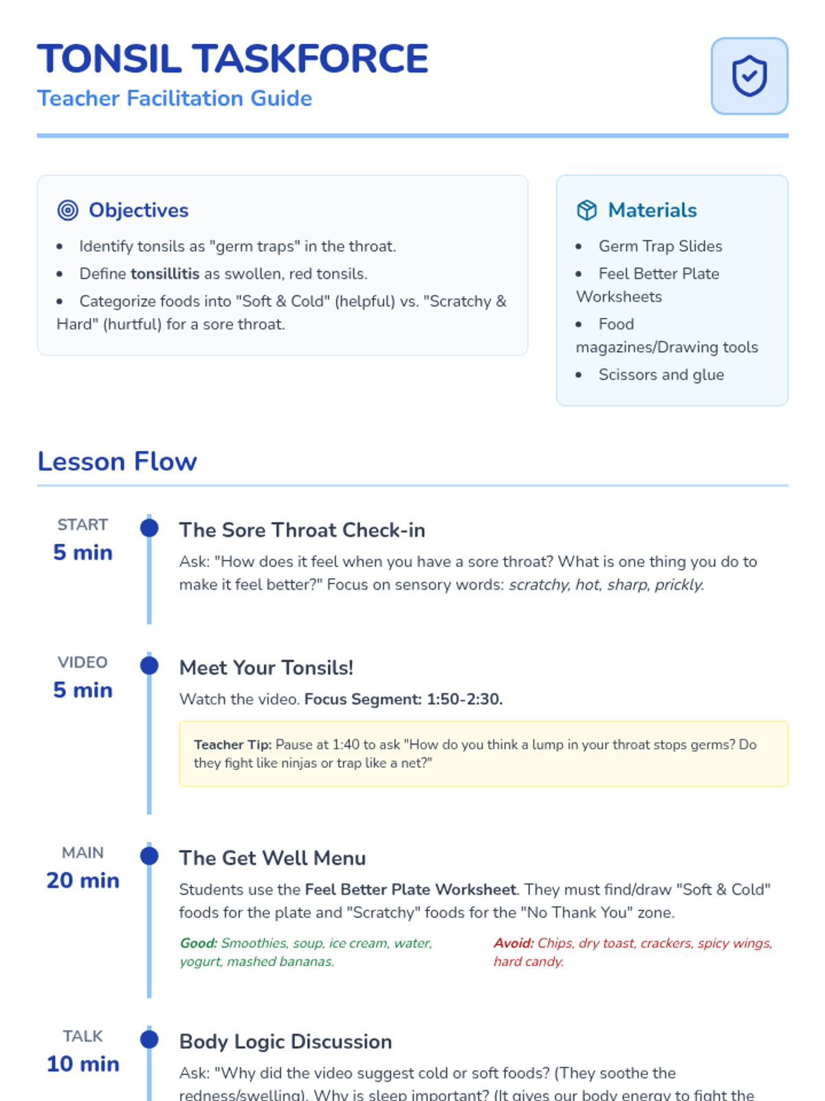 A health-focused lesson for K-3 students about how tonsils protect the body from germs and how to care for them during tonsillitis using a 'soft and cold' care plan.