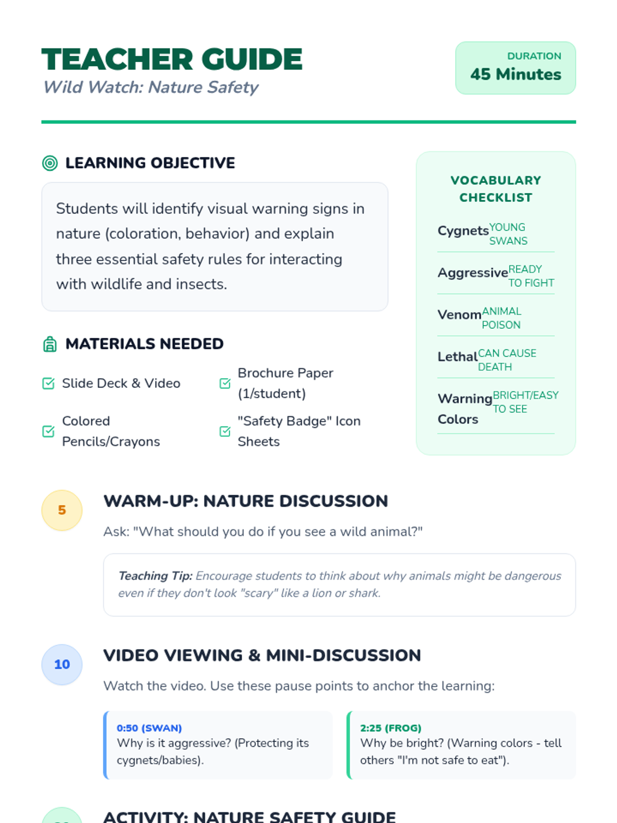 A health lesson for elementary students focused on wildlife and insect safety, using the 'Surprisingly Dangerous Animals' video to teach students how to identify warning signs and protect themselves.