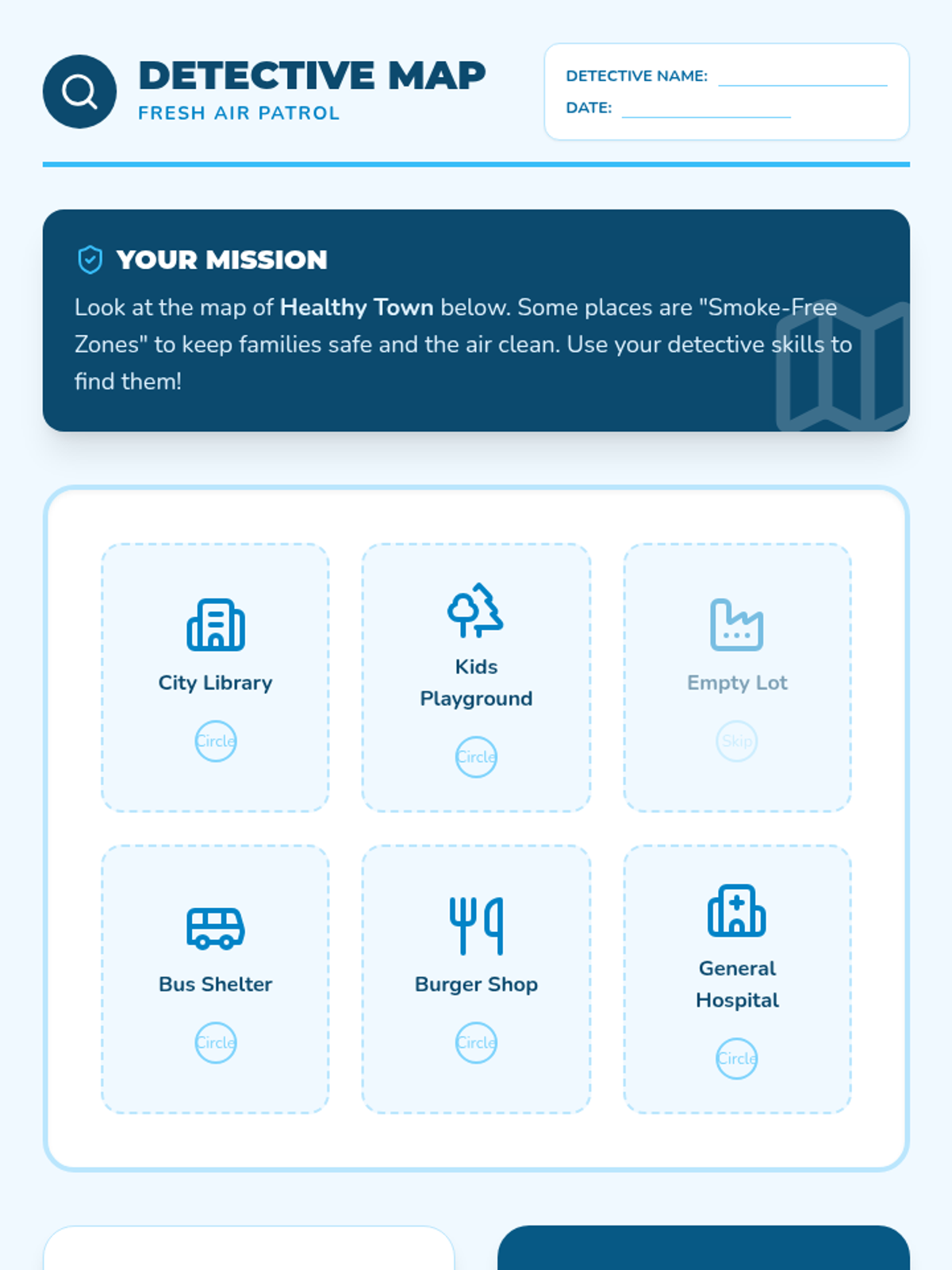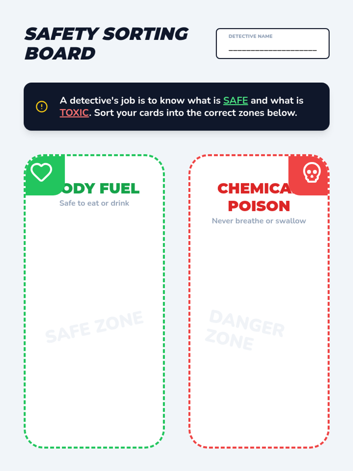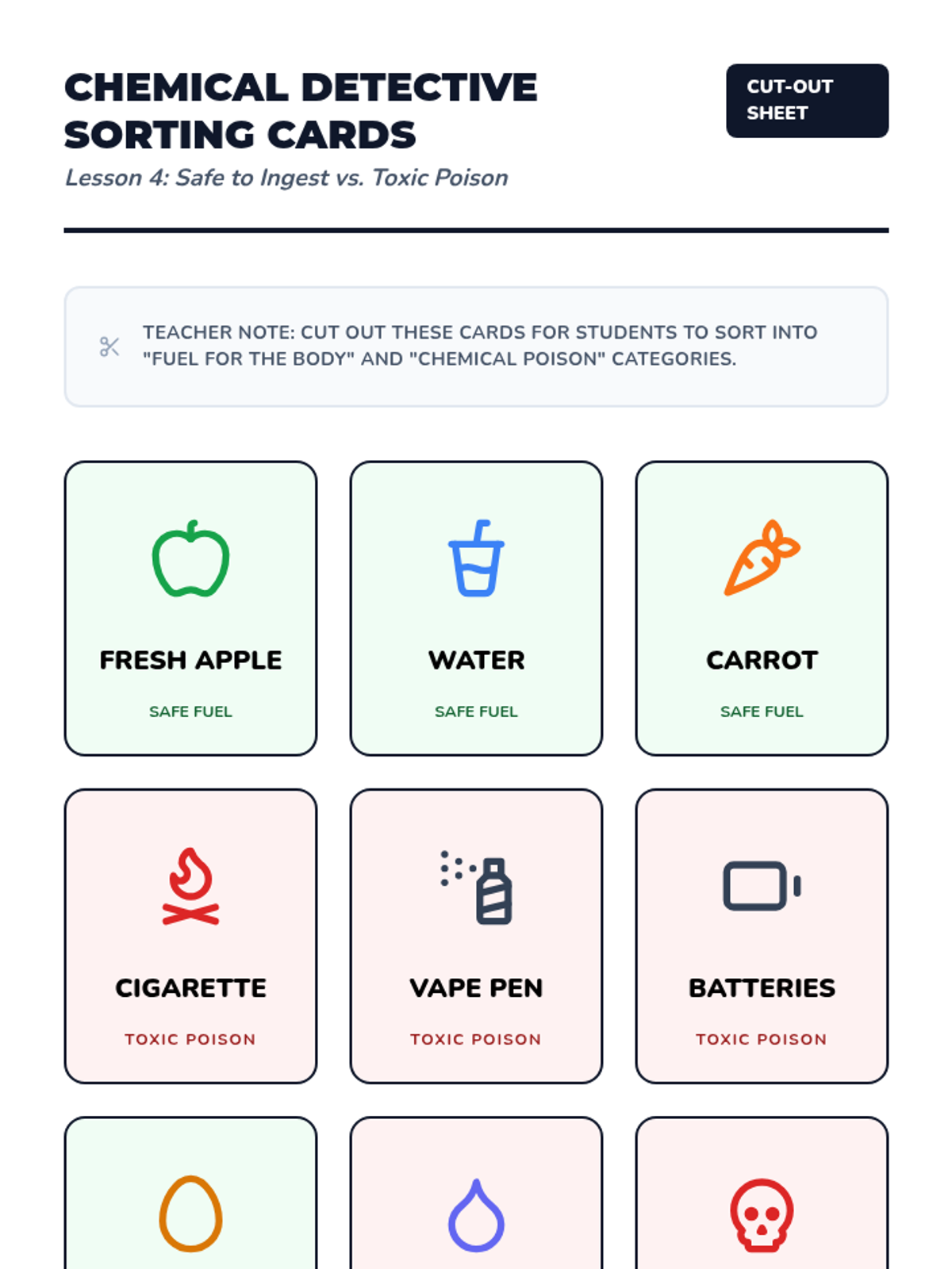 A sorting workshop where students categorize items into 'Safe to Ingest' and 'Poison/Toxic.' They place tobacco products firmly in the toxic category, reinforcing the refusal of unknown substances.