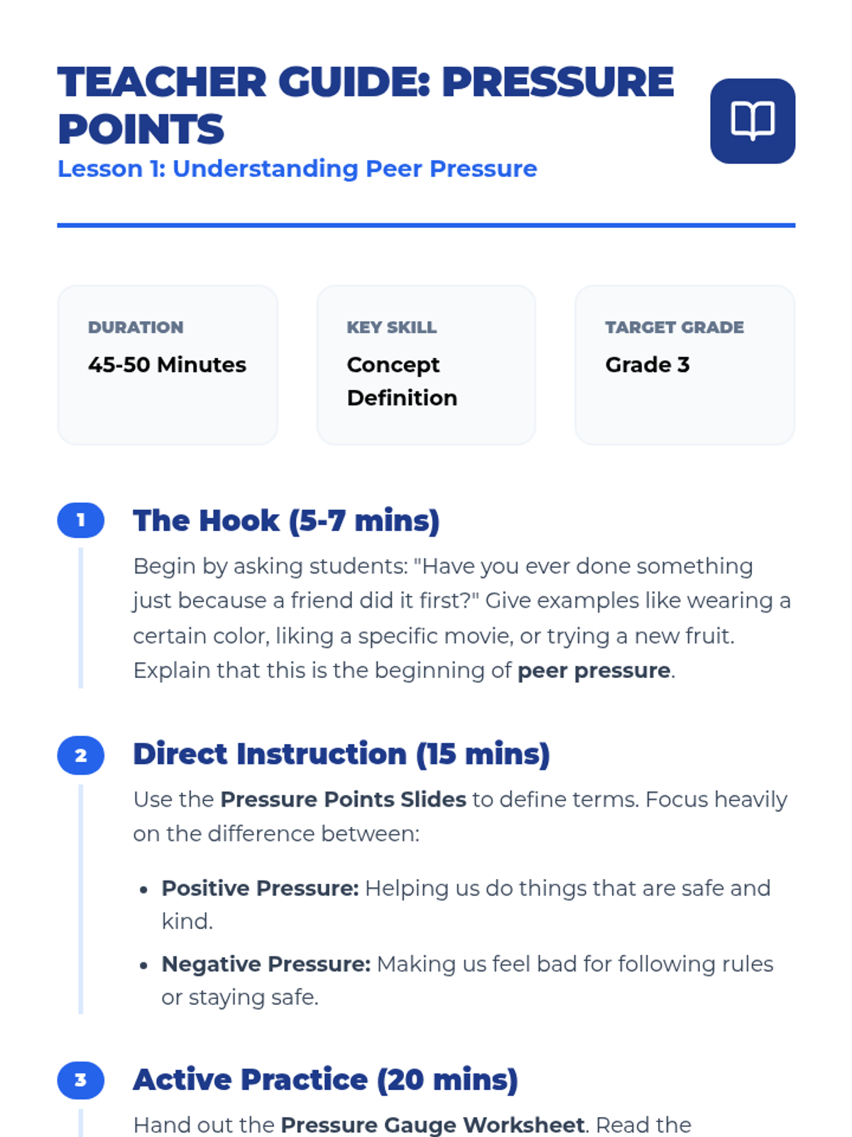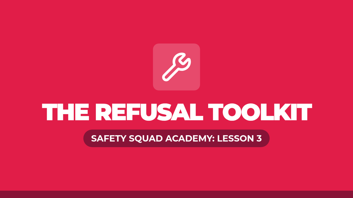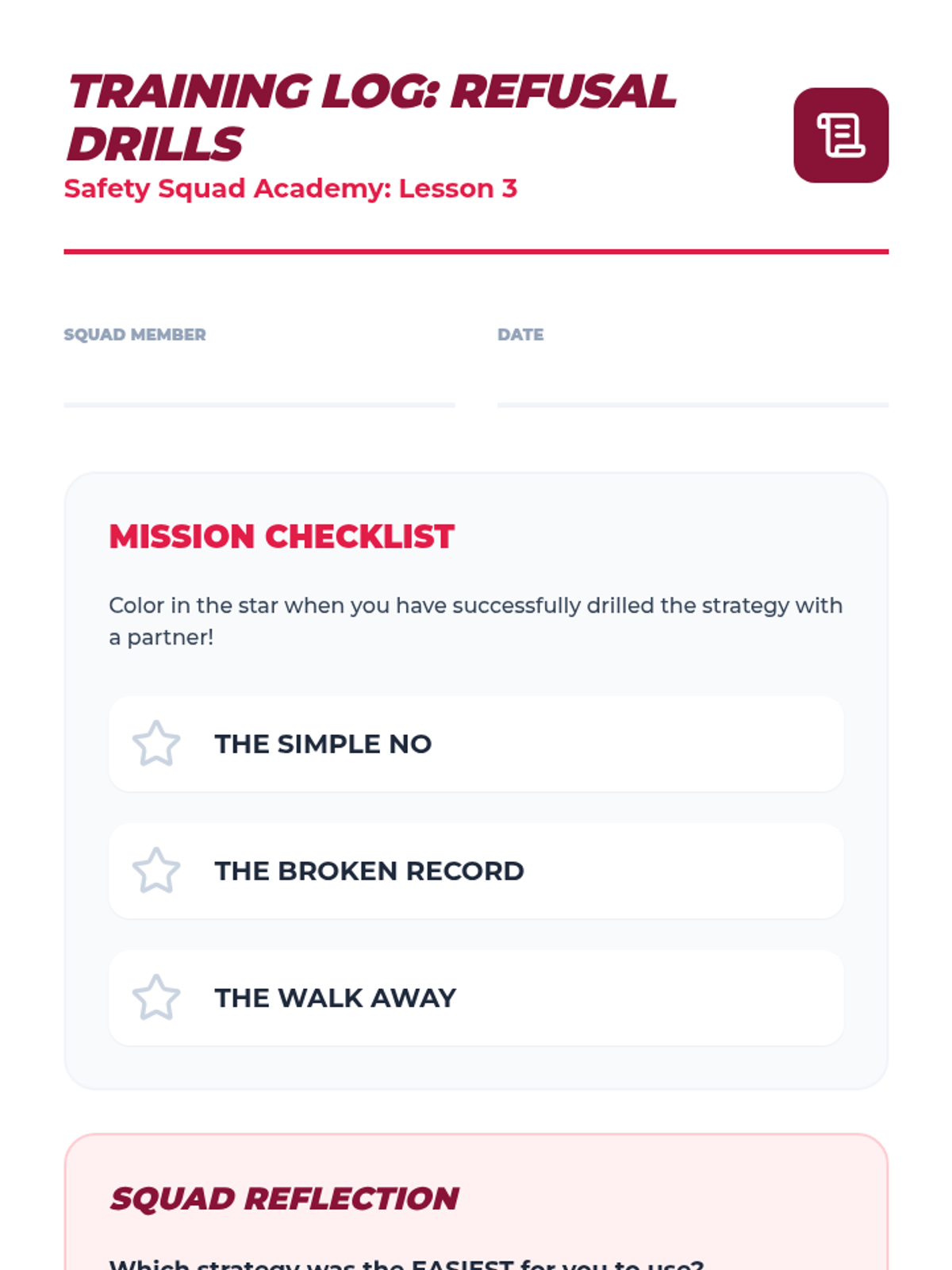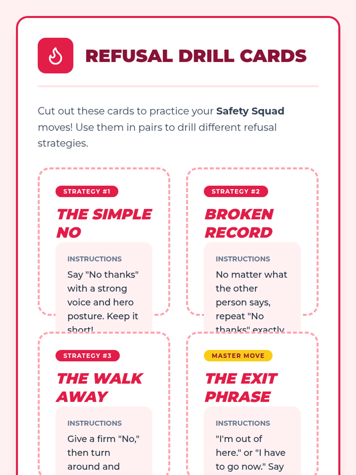 Students learn and drill three core refusal techniques: the Simple No, the Broken Record, and the Walk Away.