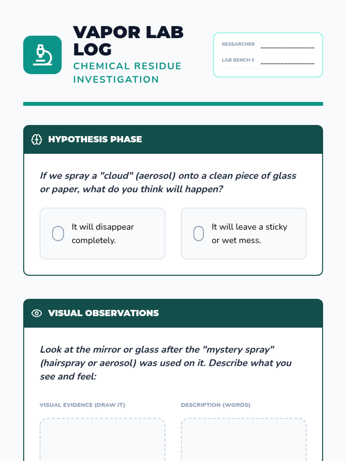 Students examine the difference between harmless water vapor and chemical aerosol using visual aids. They debunk the myth that e-cigarettes are just 'flavored water' by identifying the chemical residue left behind.