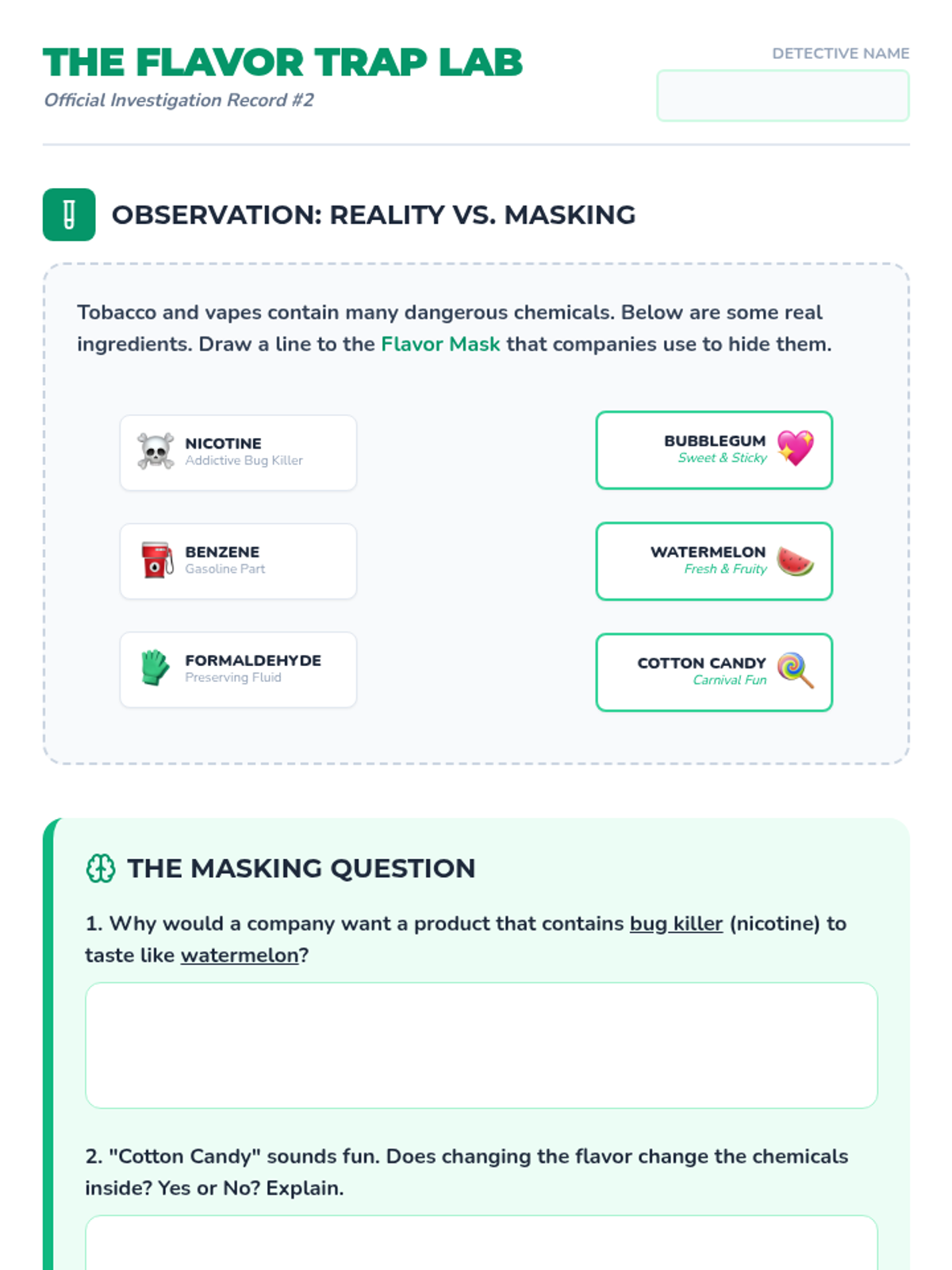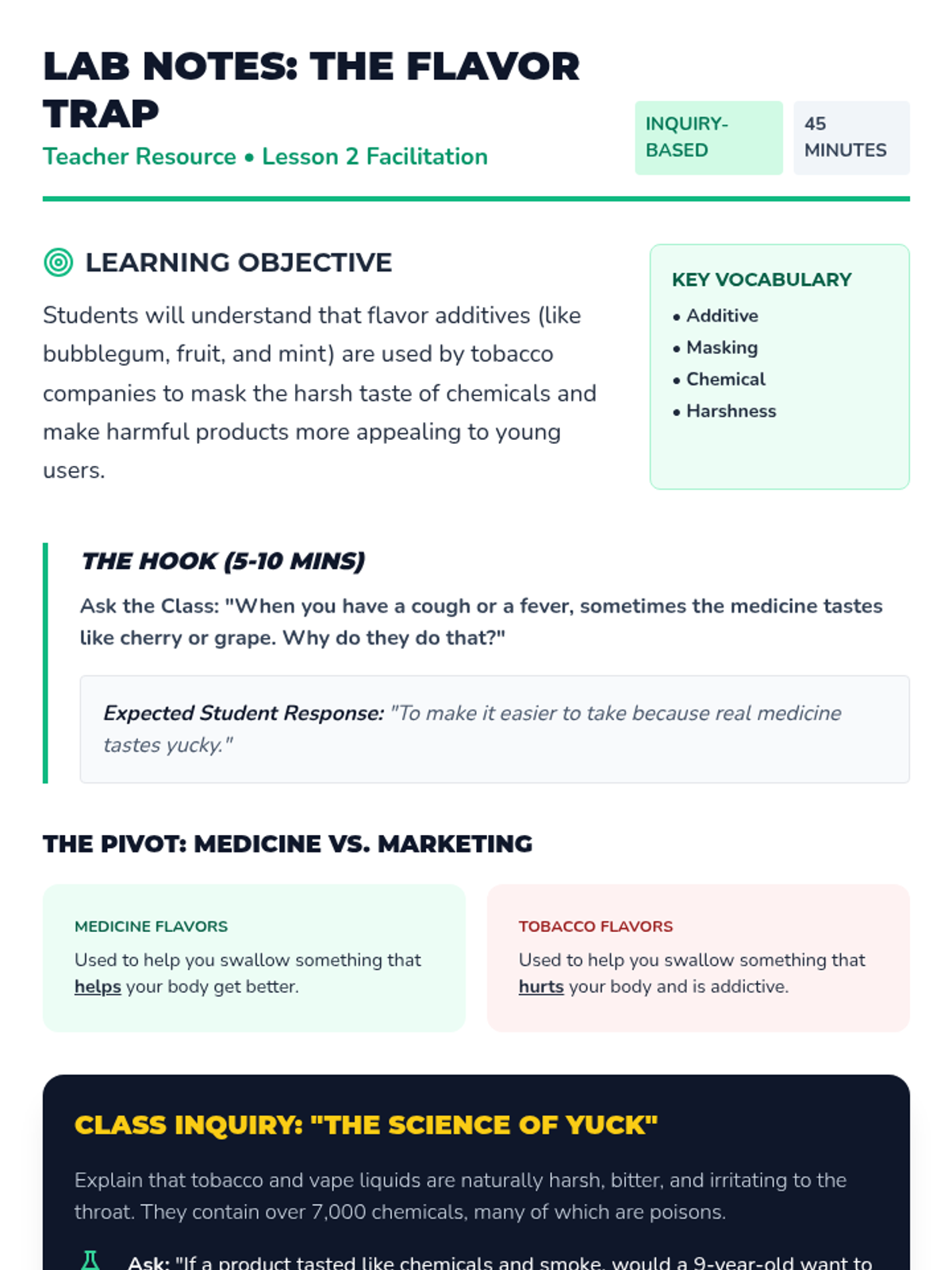In this lesson, students explore the strategic use of sweet flavors in tobacco and vaping products. They discuss why companies use 'kid-friendly' tastes like bubblegum or fruit to hide the harshness of chemicals.