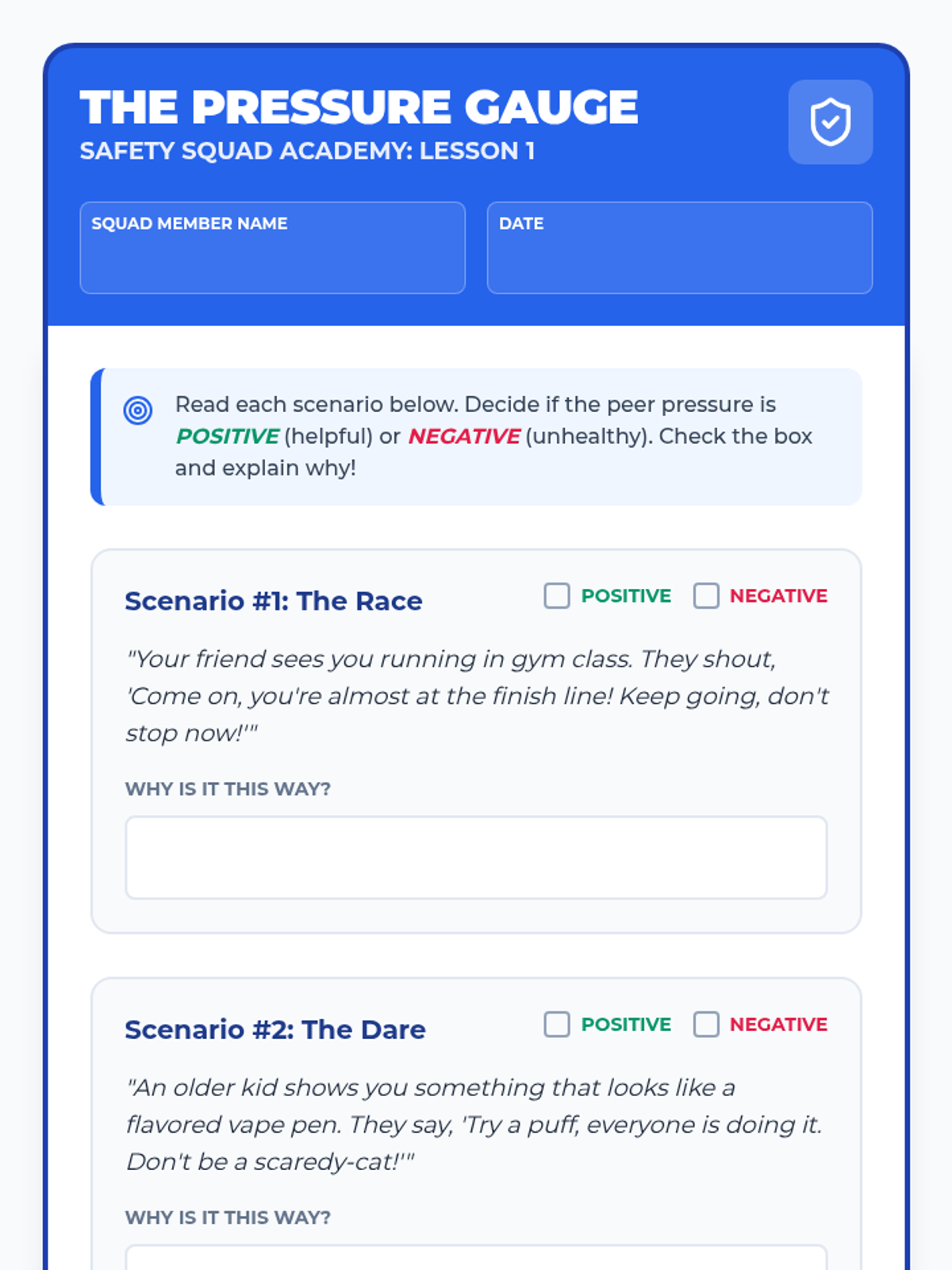 Students practice the 'No, let's...' technique to redirect peer pressure toward healthy and fun alternatives.