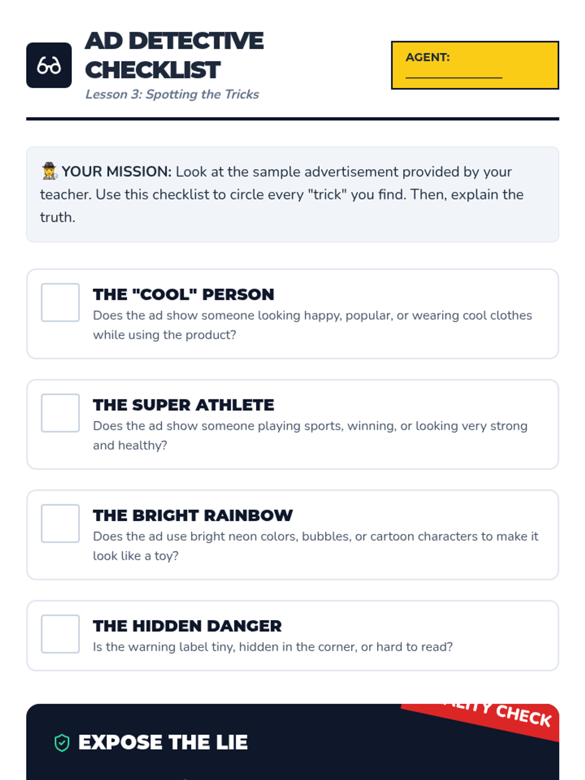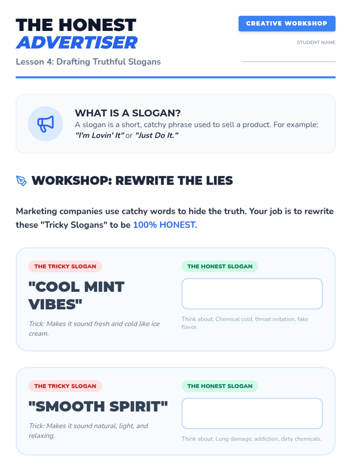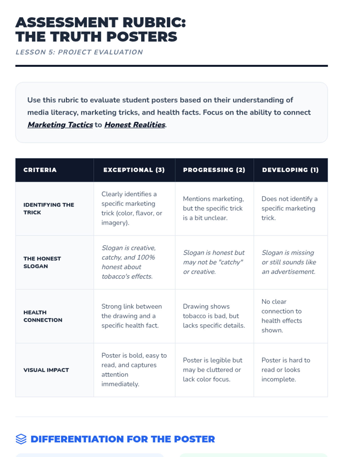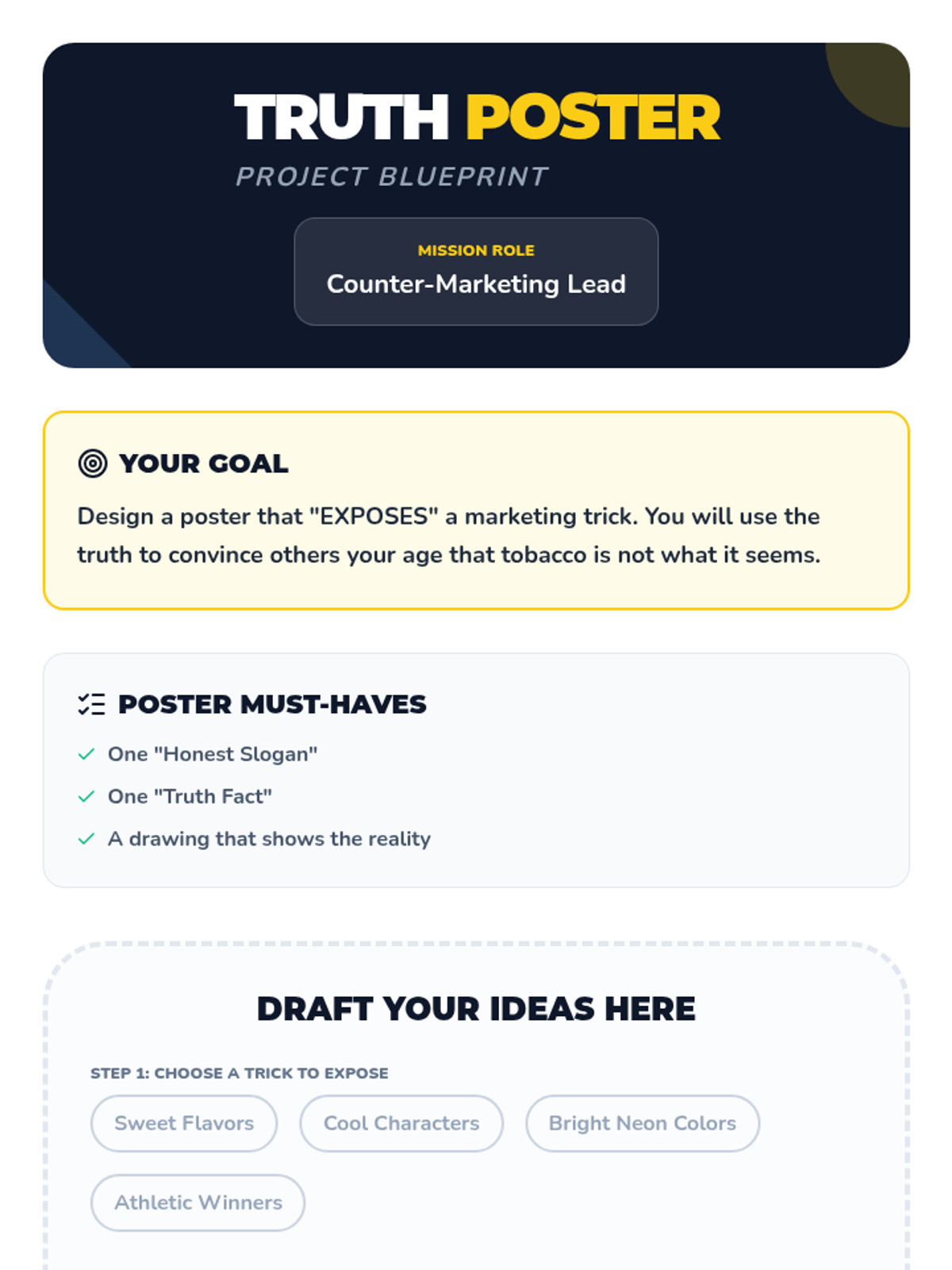 Students synthesize their learning by designing their own 'Truth Posters.' These counter-advertisements use visual design and honest messaging to expose the marketing tactics of the tobacco industry.