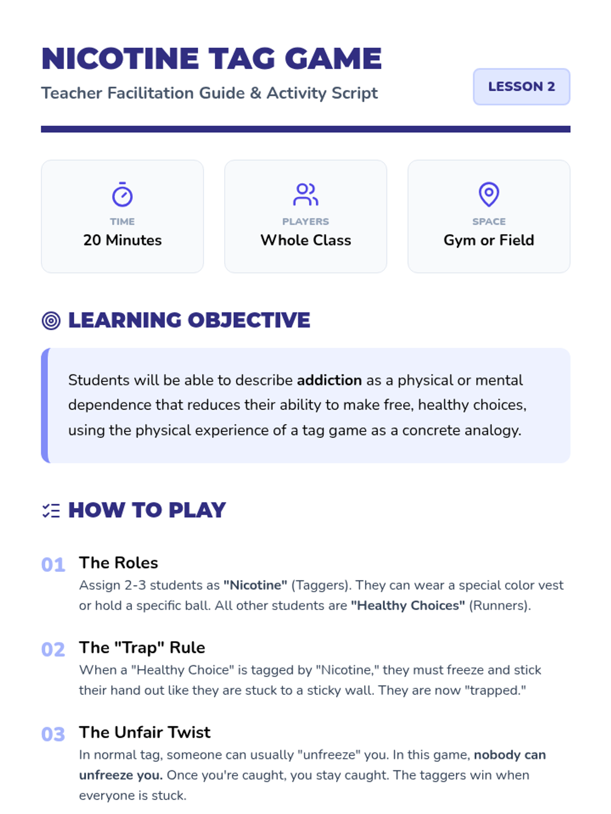 Students learn about nicotine and the concept of addiction through a tag-style game. The lesson defines nicotine as a chemical that 'tricks' the brain and explains addiction as losing the freedom to choose healthy habits.