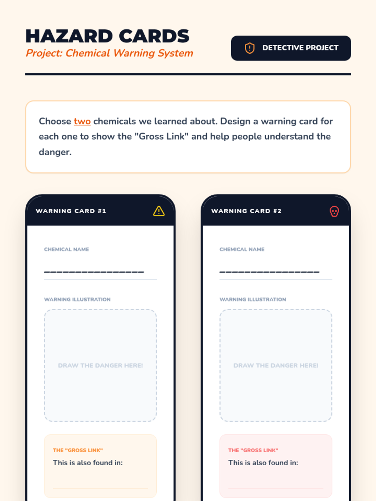 Students design their own warning labels or trading cards for specific chemicals found in tobacco (e.g., Formaldehyde, Lead). They list where else the chemical is found to solidify the 'gross' factor.