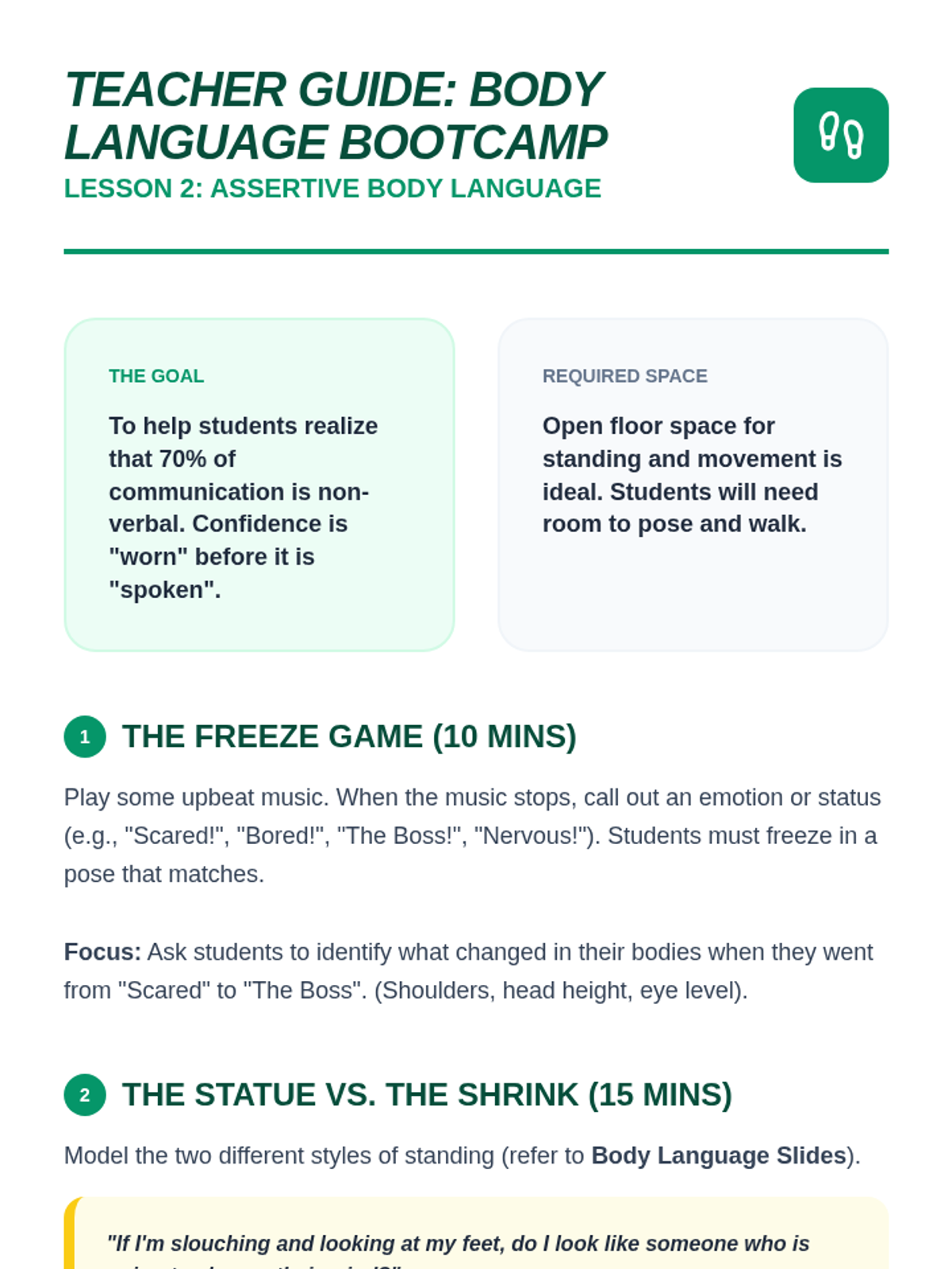 A physical workshop focusing on non-verbal communication, teaching students how to use posture, eye contact, and voice to show confidence.