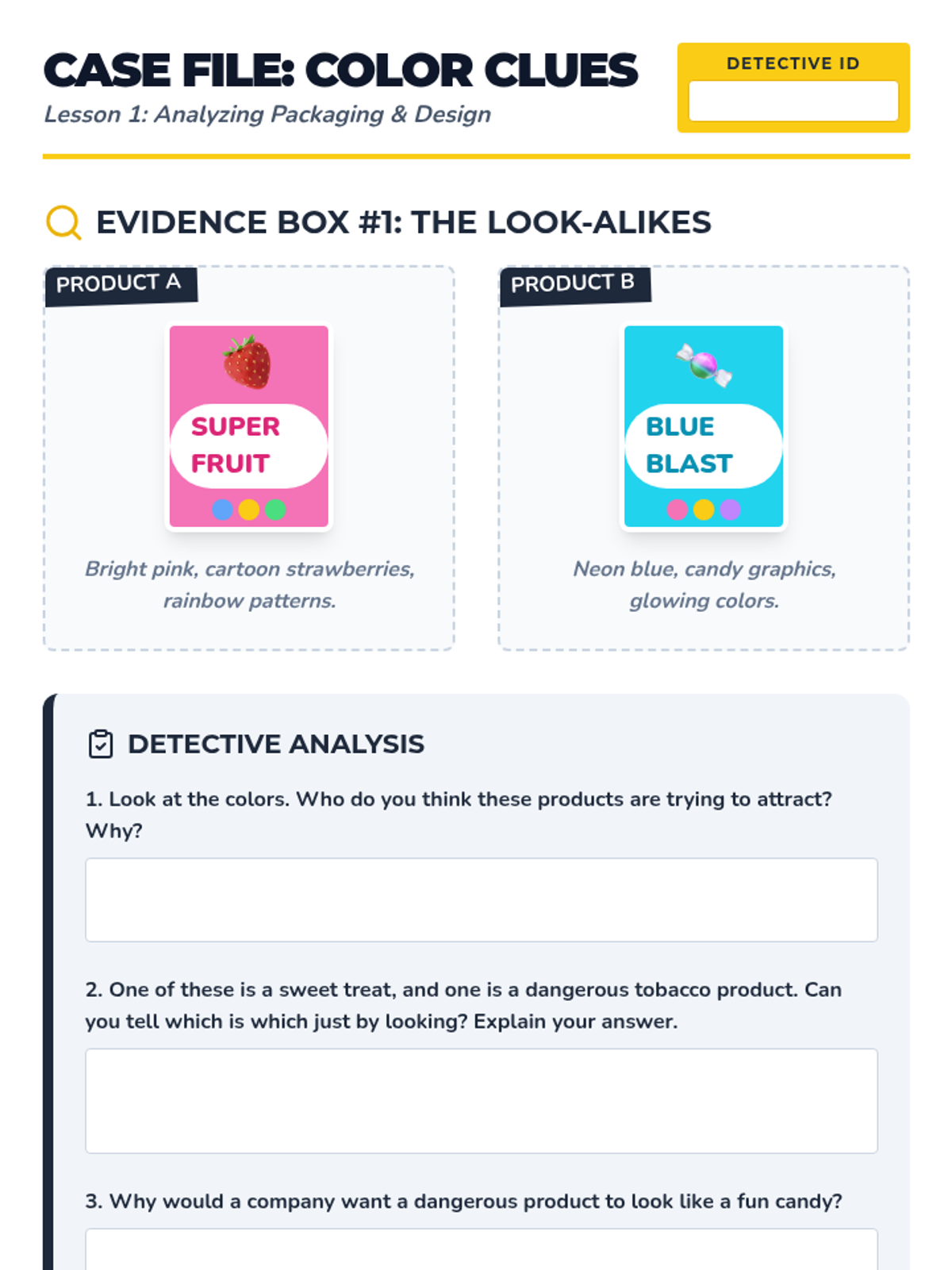 Students investigate how bright colors and cartoon-like designs are used in tobacco packaging to mimic candy and attract children. They develop visual analysis skills to distinguish between products meant for kids and dangerous substances.