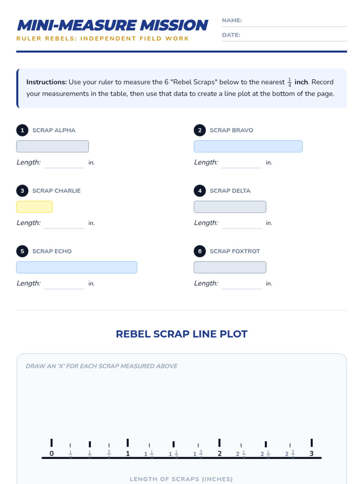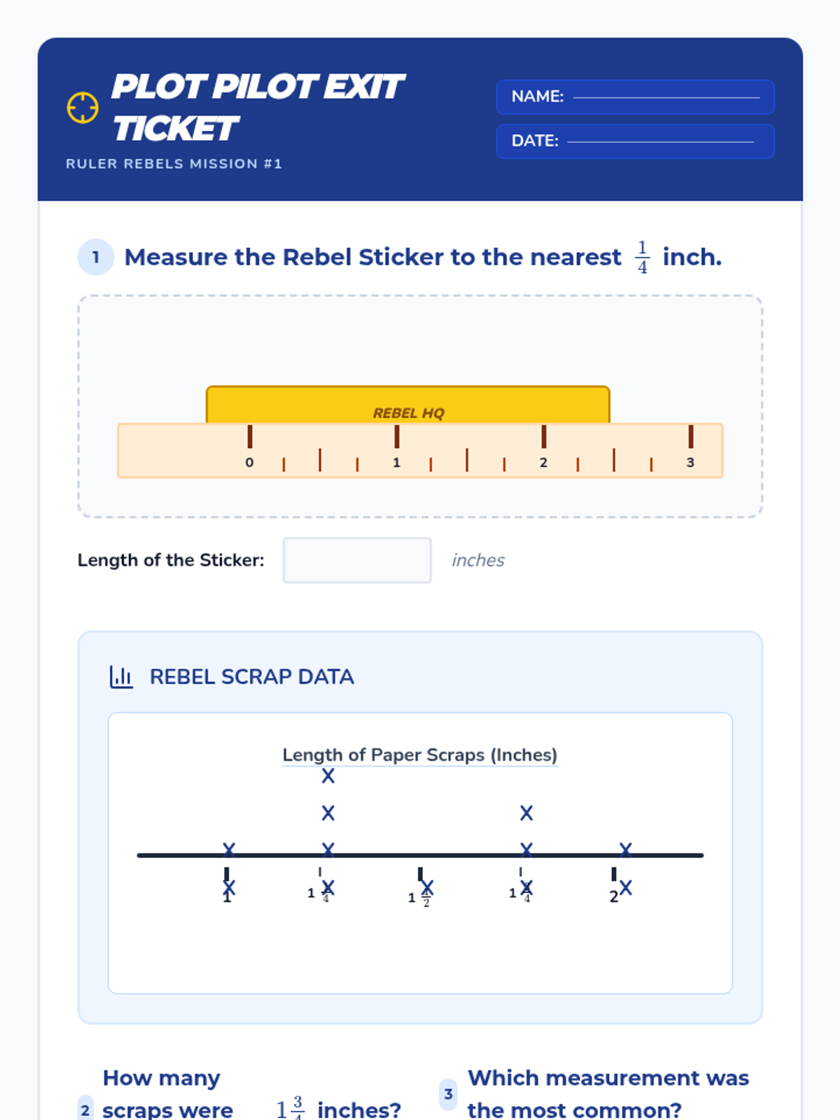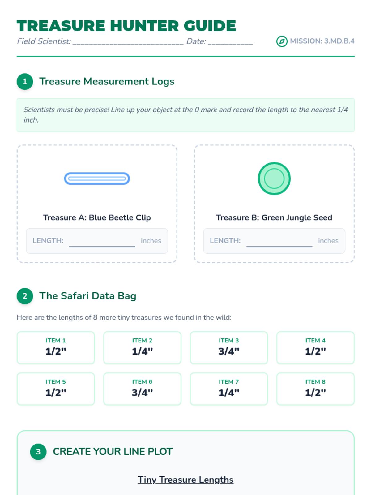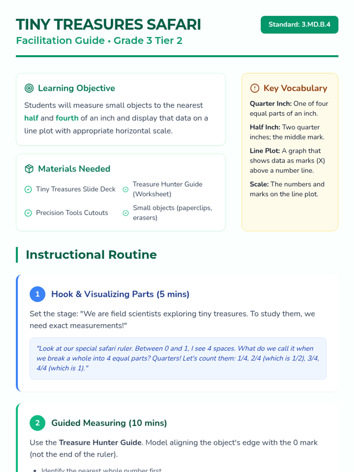 A Tier 2 intervention lesson focused on measuring objects to the nearest quarter inch and creating line plots to represent the data. This lesson uses a field scientist theme to engage students in precise measurement.