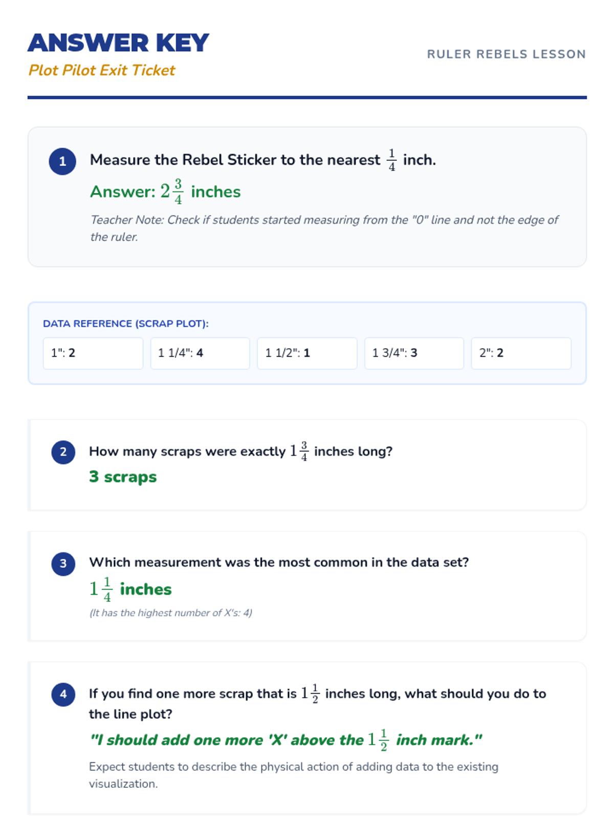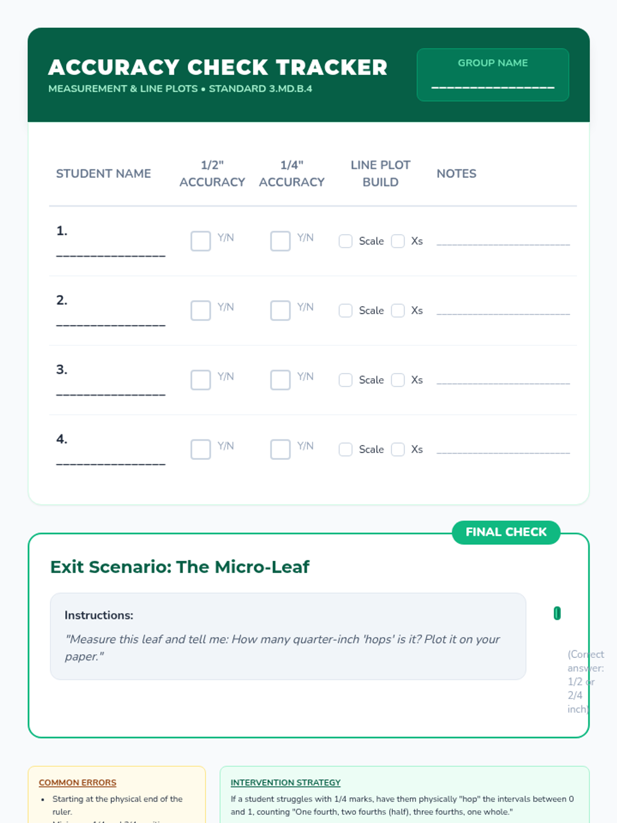 A targeted Tier 2 intervention lesson focusing on reading rulers to the nearest quarter-inch and representing that data on line plots. Includes scaffolded identification of markings, hands-on measuring, and data visualization.