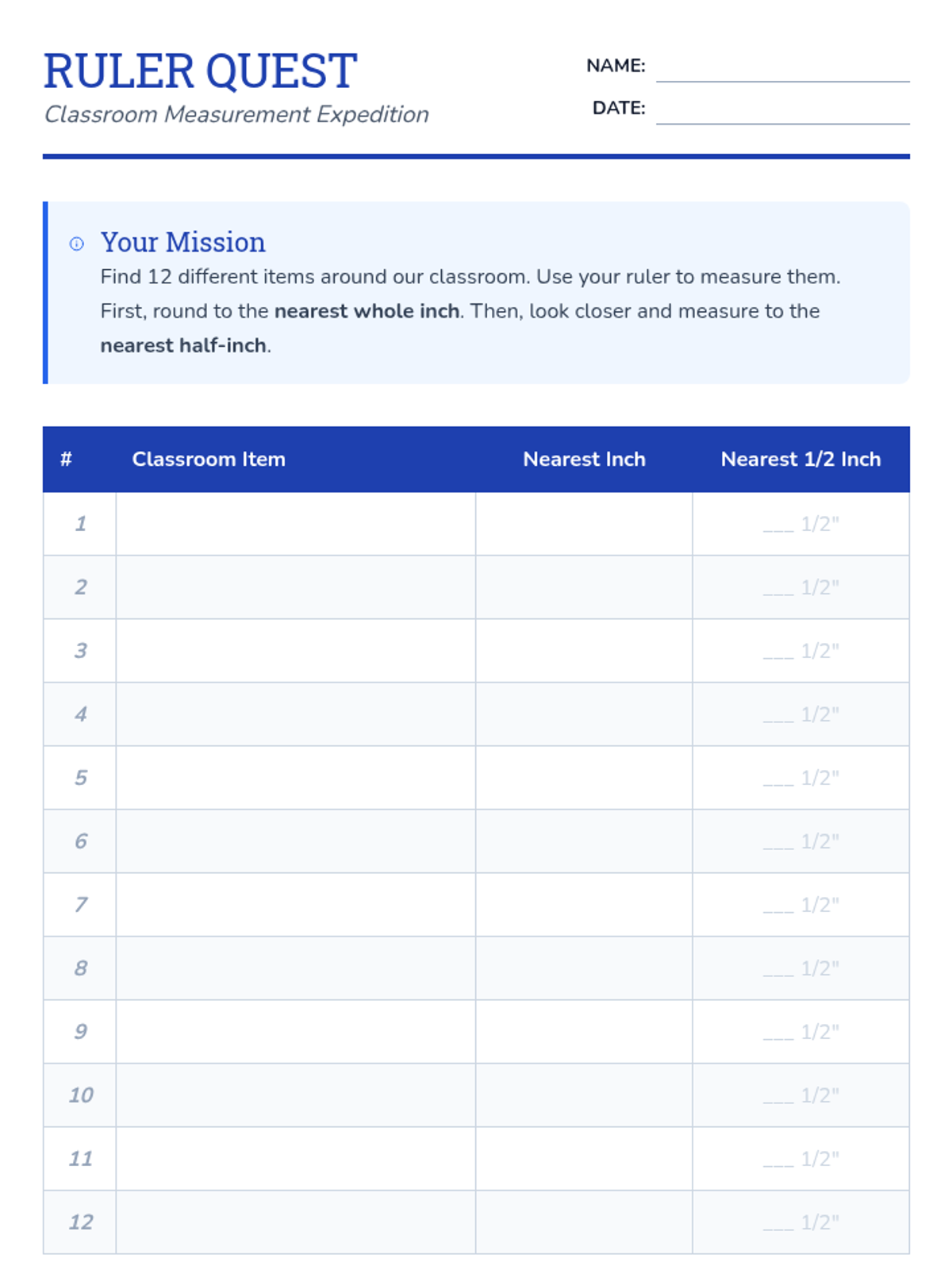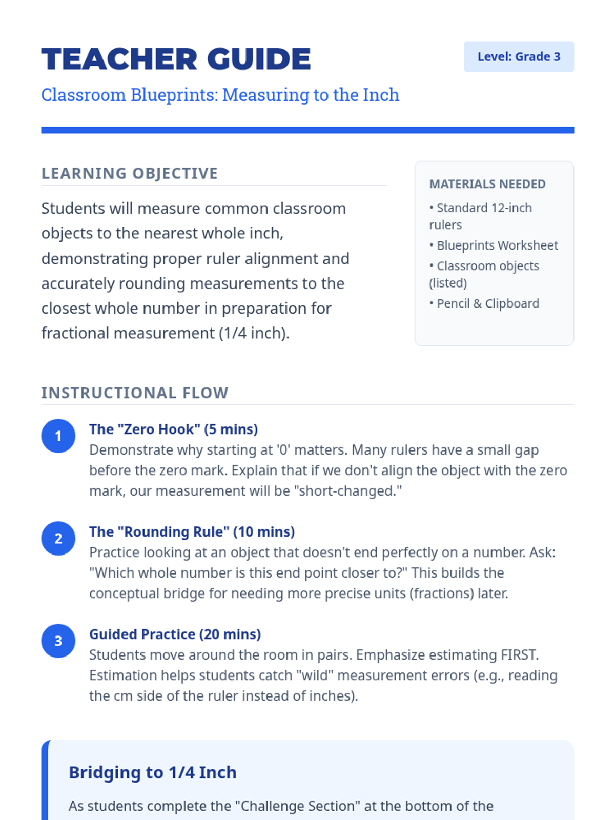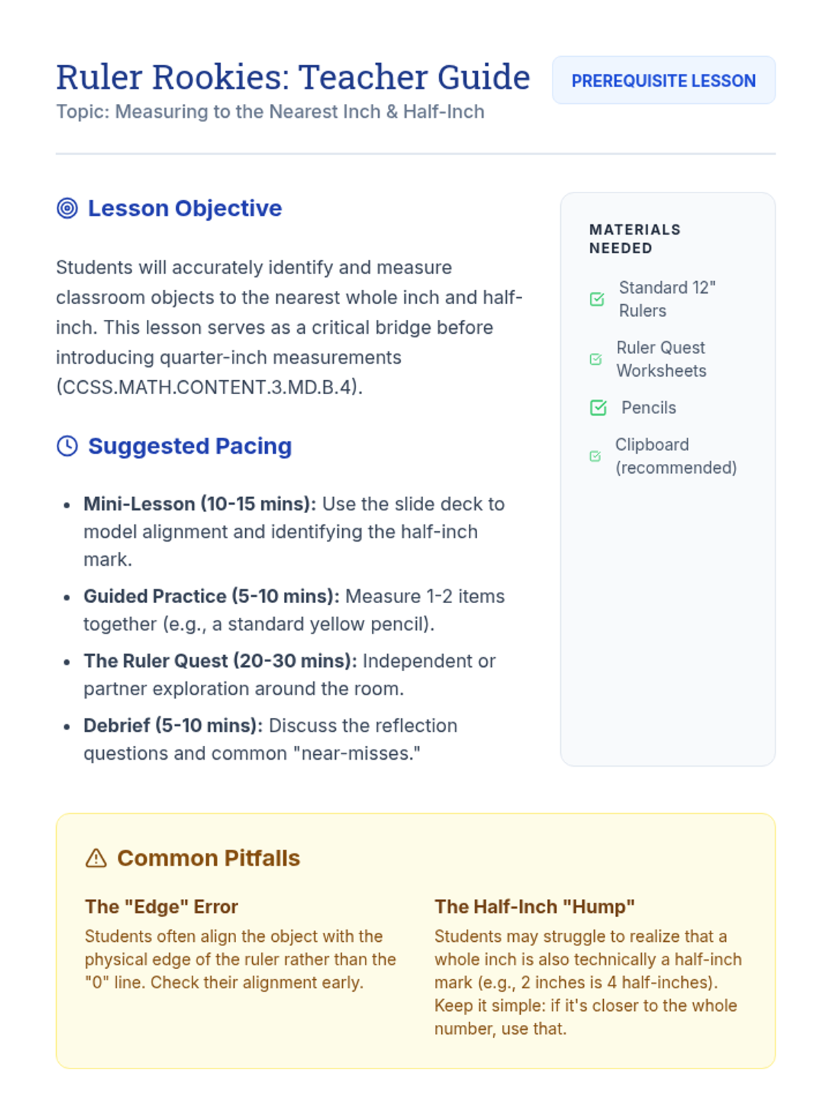 A foundational lesson for 3rd graders to master measuring classroom objects to the nearest inch and half-inch before progressing to quarter-inches.