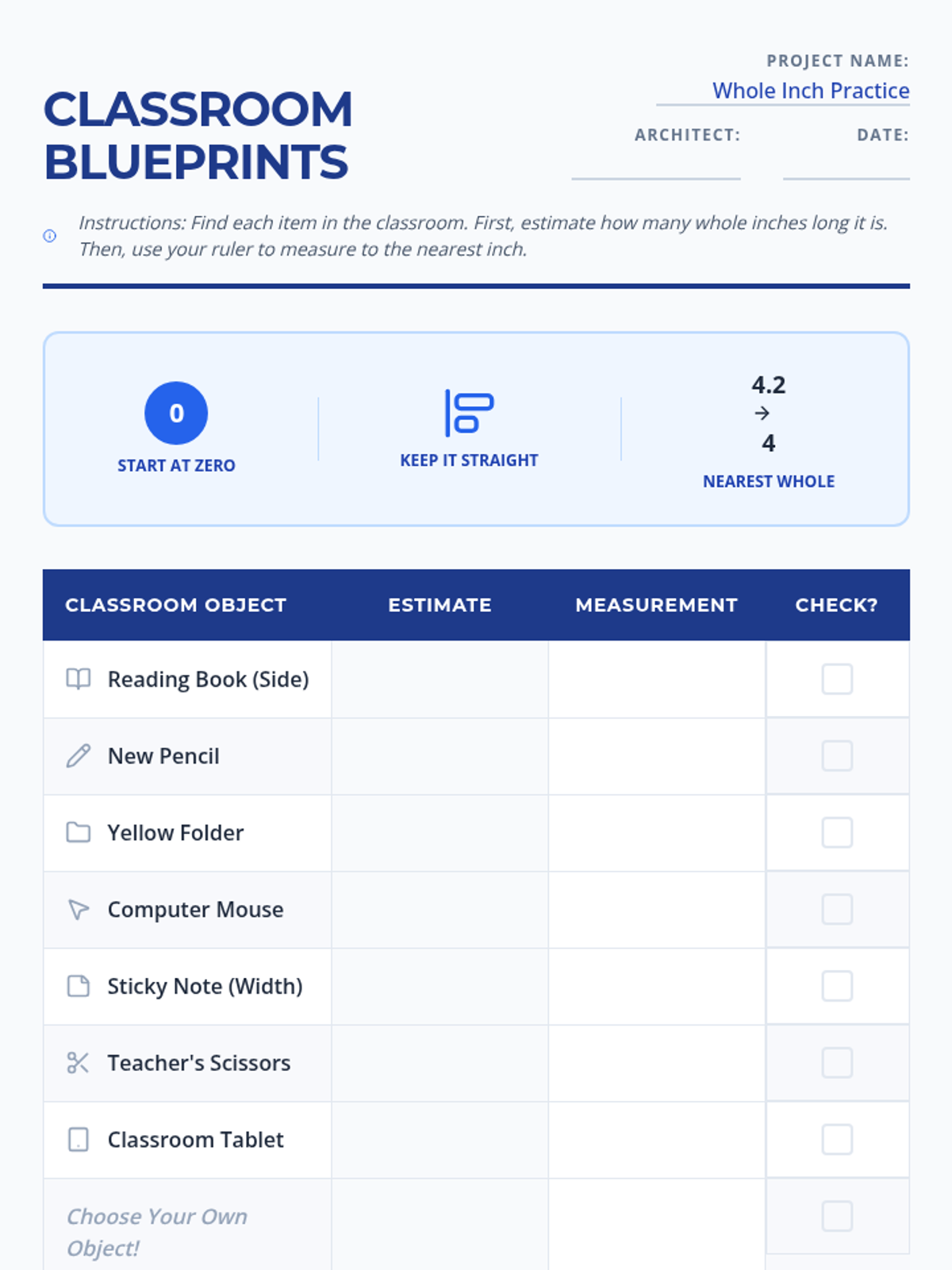 A foundational lesson focused on measuring common classroom objects to the nearest whole inch to prepare students for fractional measurement. Students will practice alignment, starting at zero, and rounding to the nearest whole unit.