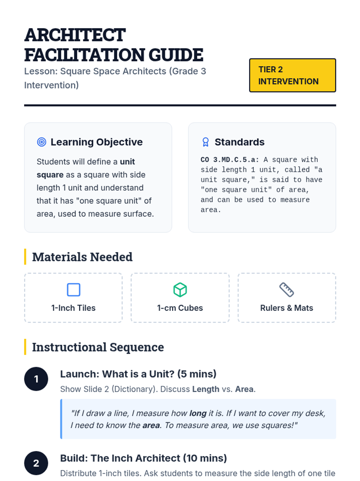 A Tier 2 intervention lesson focusing on the definition of a unit square and square units. Students build and identify unit squares using various scales (cm vs. inches) to understand area as a measurement of surface.
