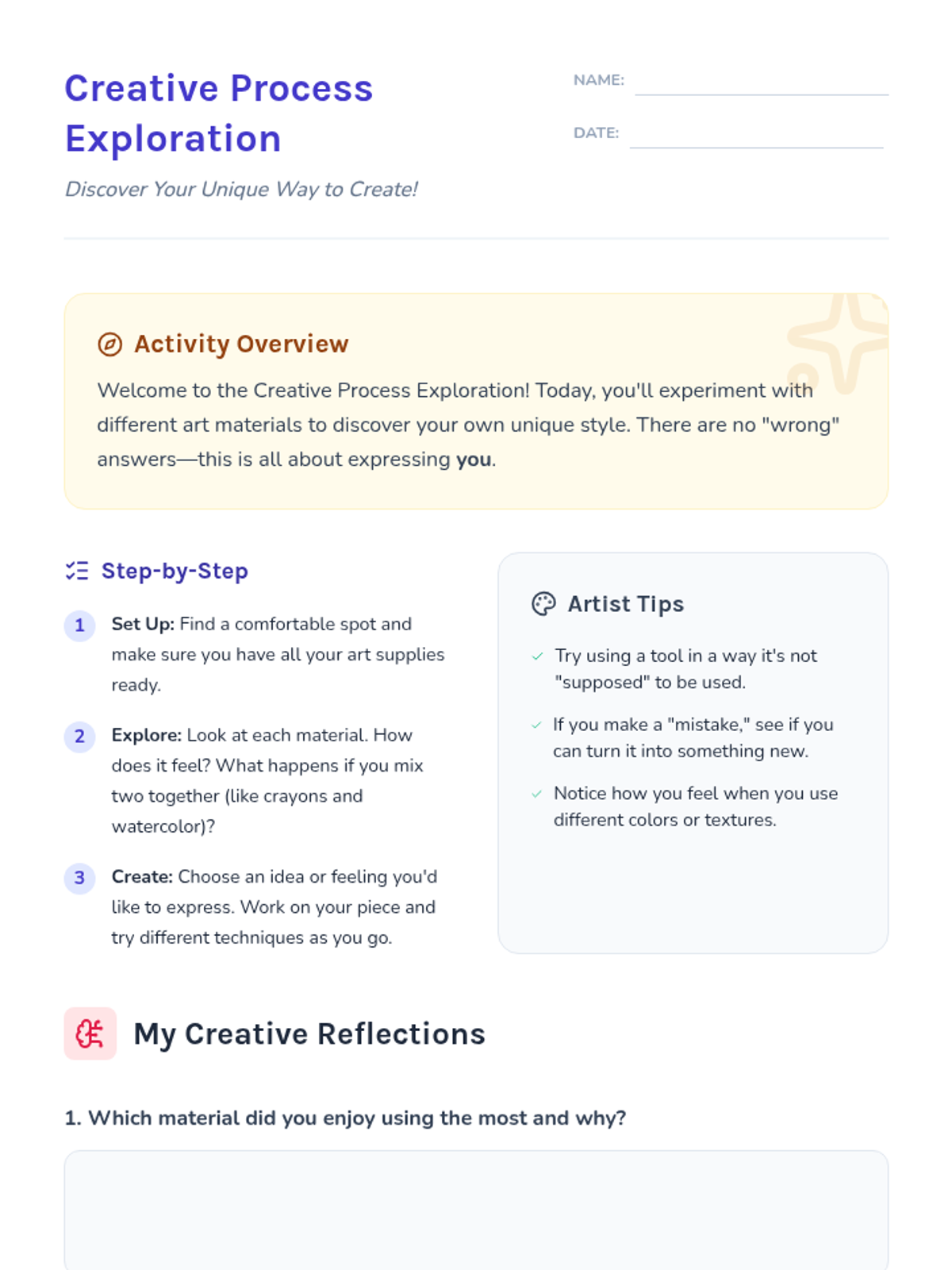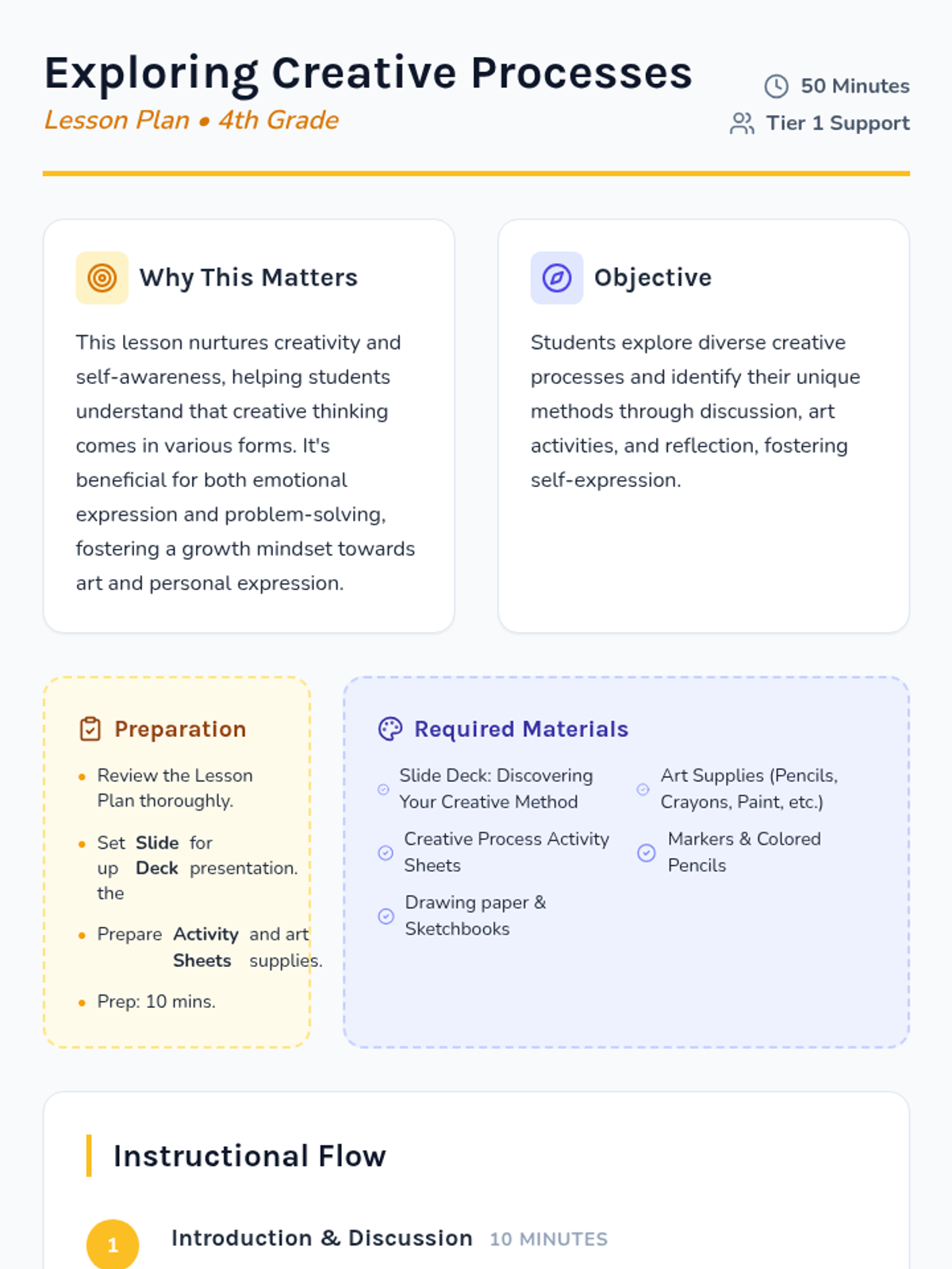 A lesson designed for 4th graders to explore different creative processes and discover their unique artistic methods through hands-on activities and reflection.