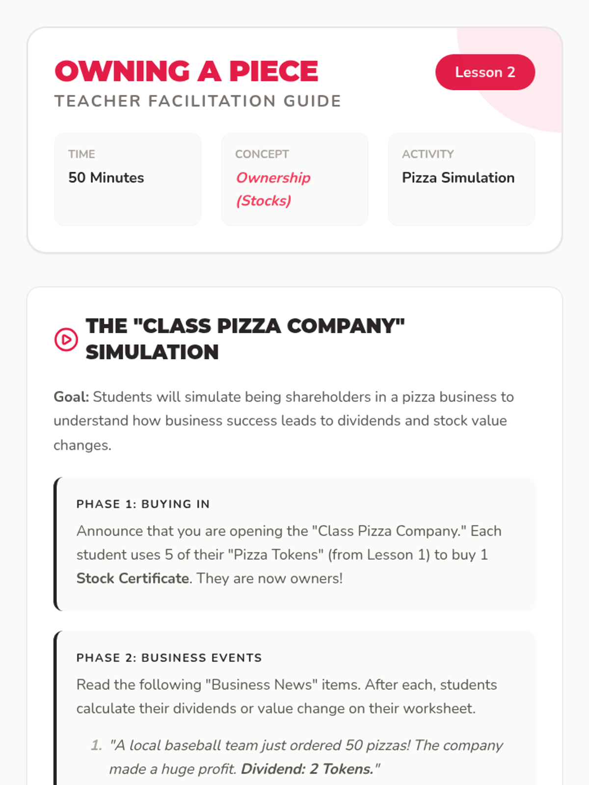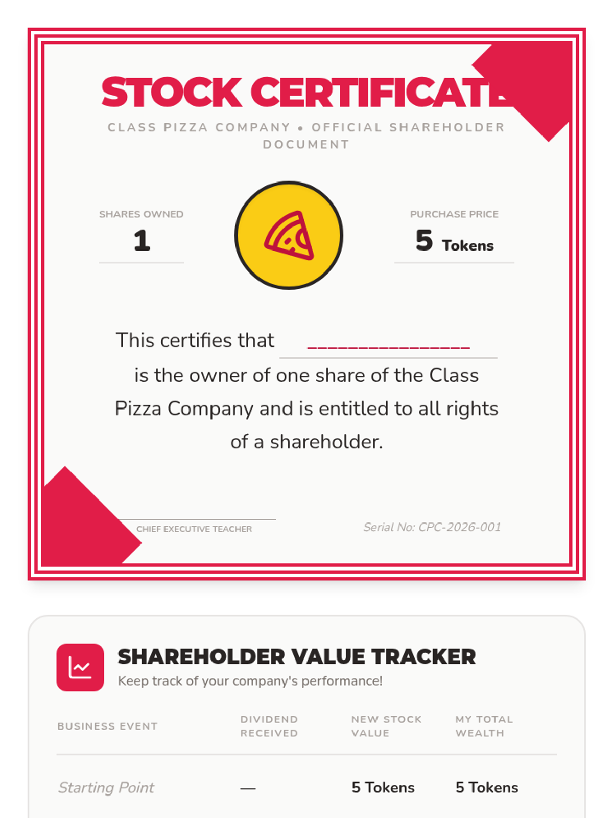 An introduction to stock ownership where students become 'shareholders' in the Class Pizza Company, learning how profits and business performance affect value.