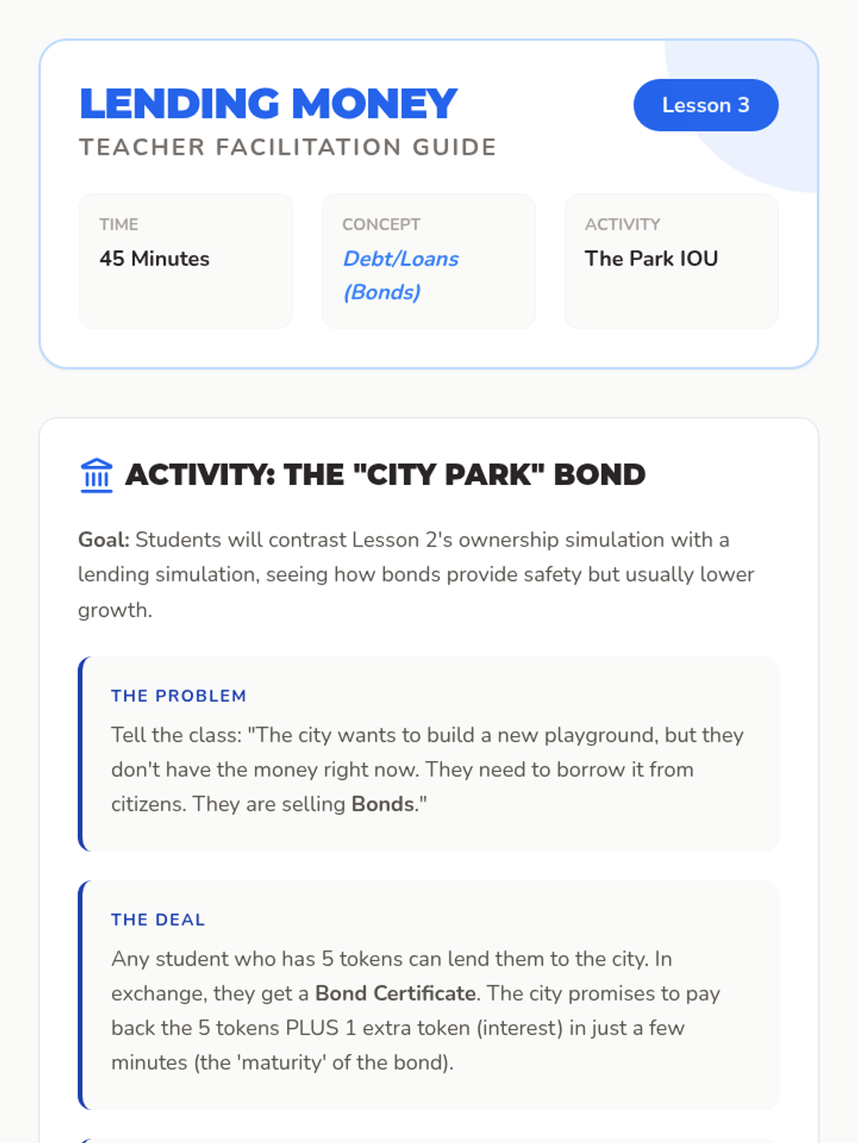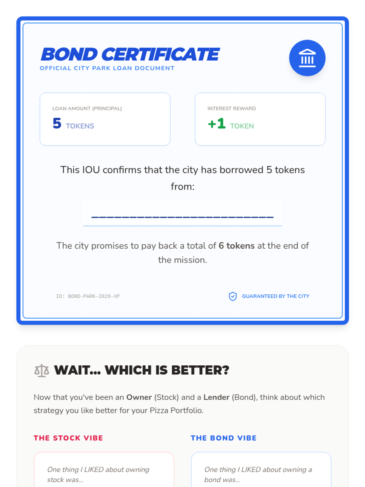Students contrast ownership with lending by exploring bonds as loans to the government, understanding the trade-off between safety and growth.