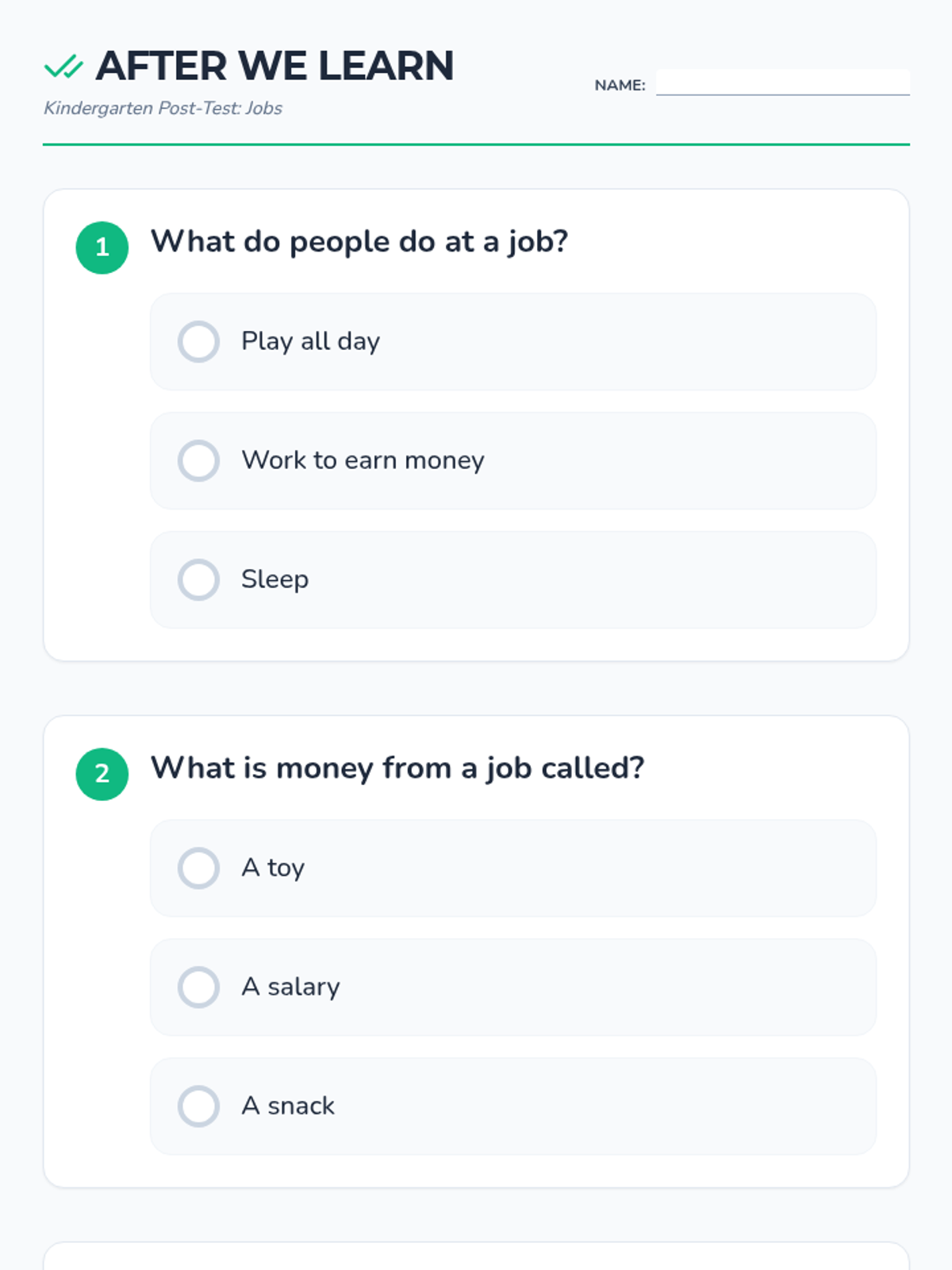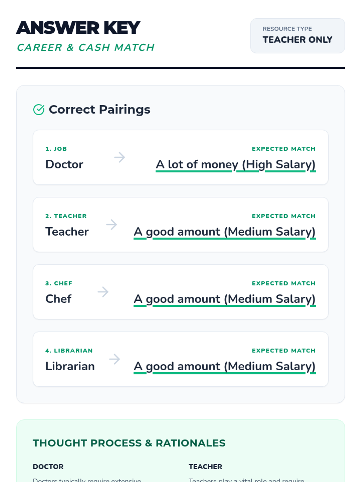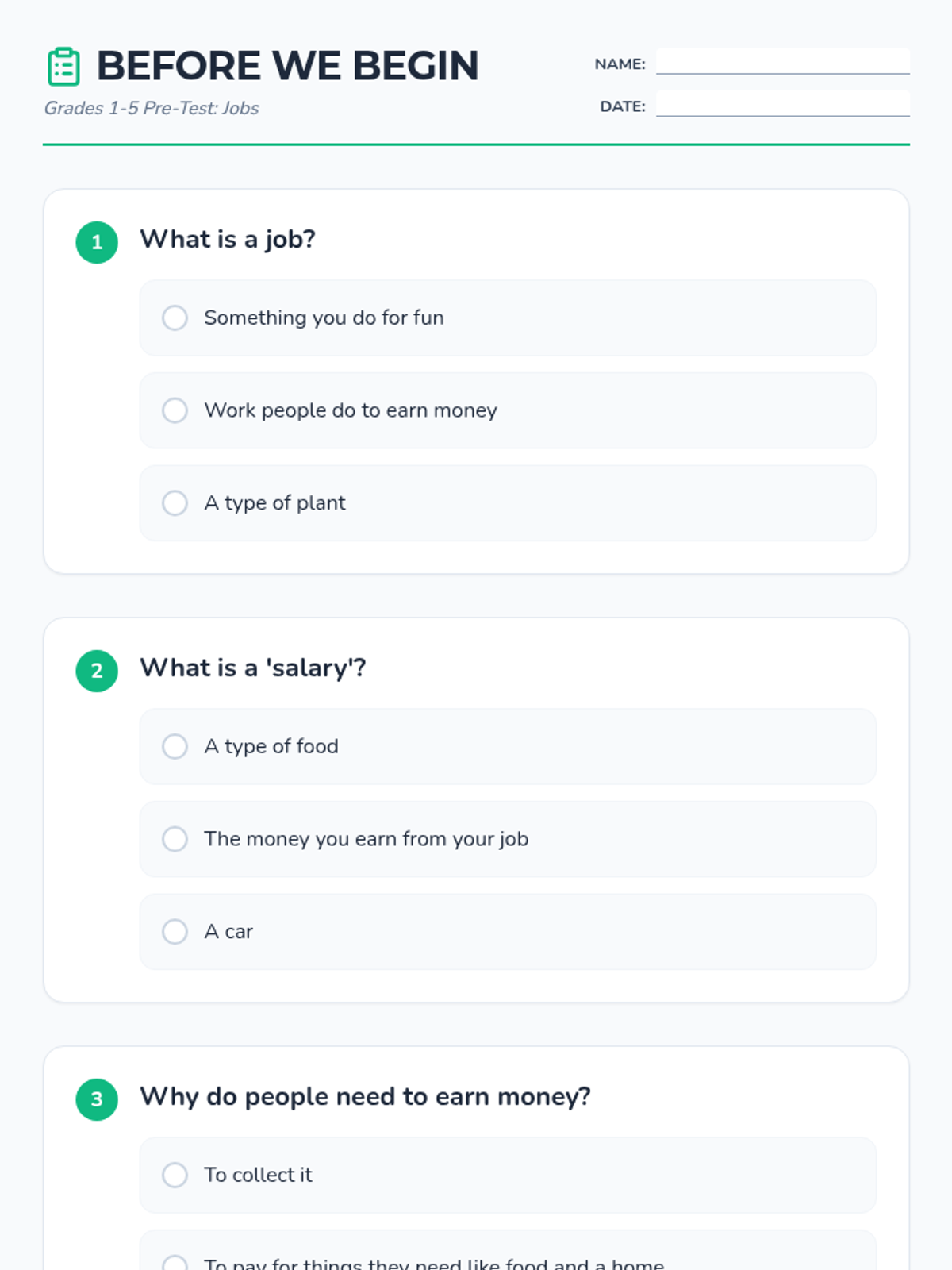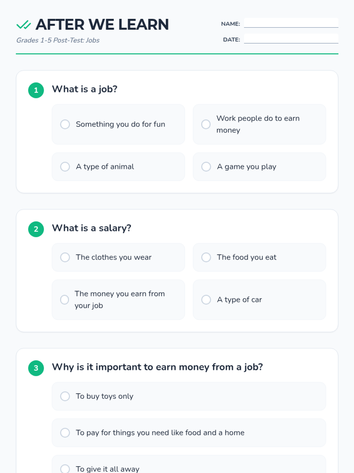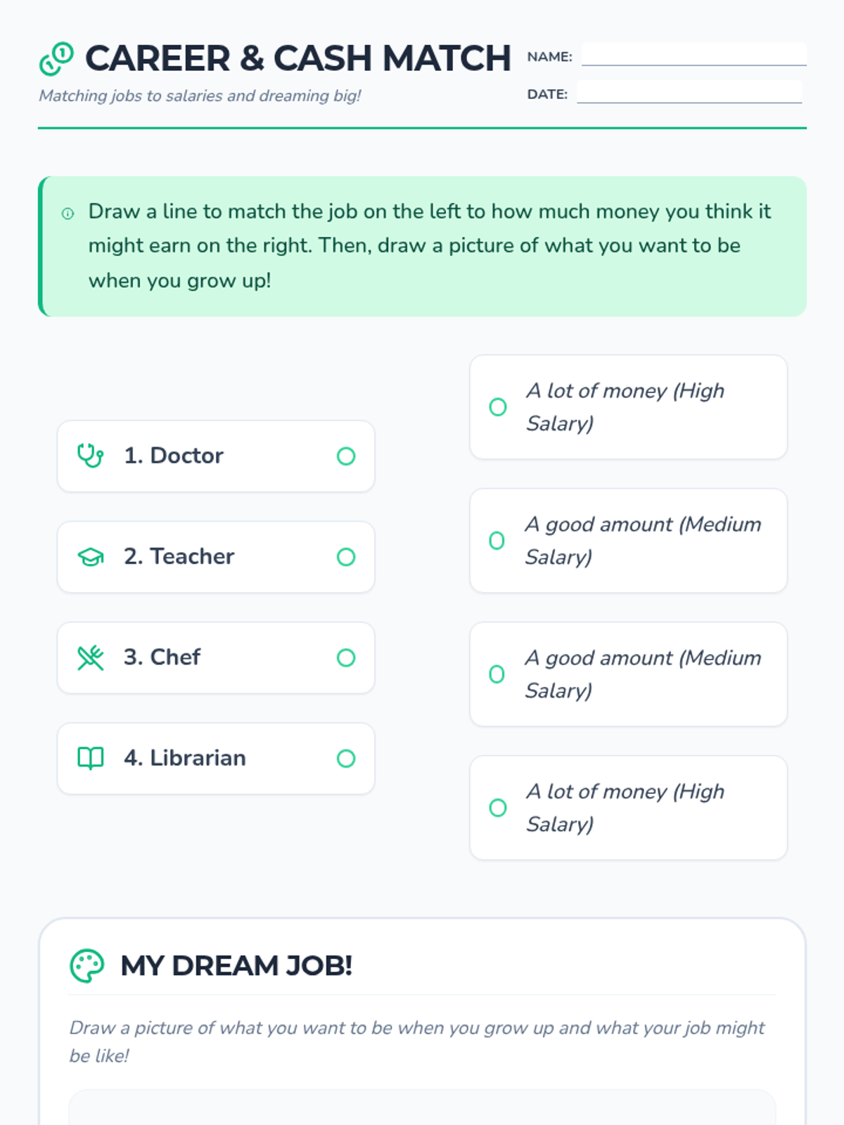 Students explore how people earn money through different jobs and the concept of income as an exchange for labor.