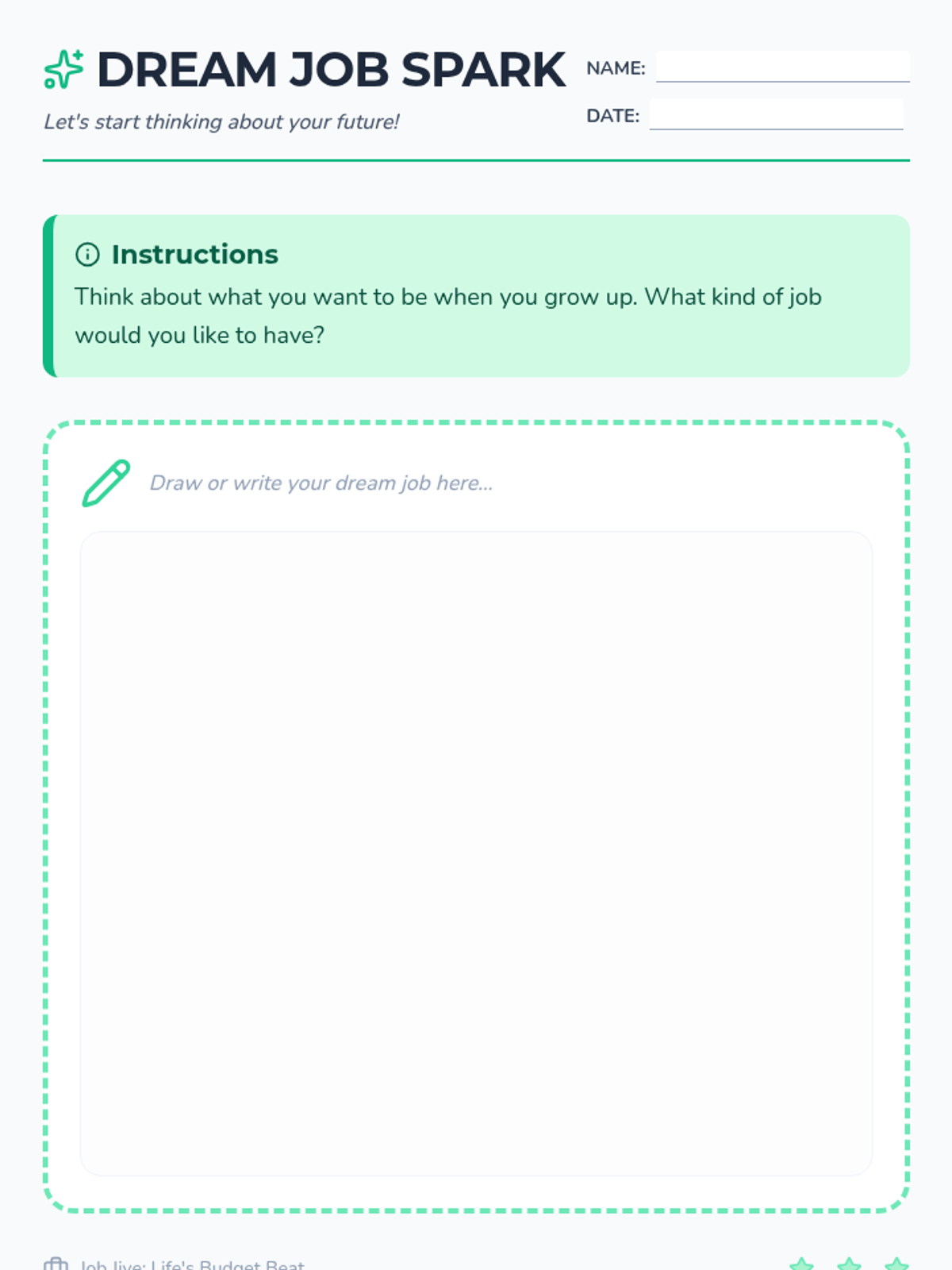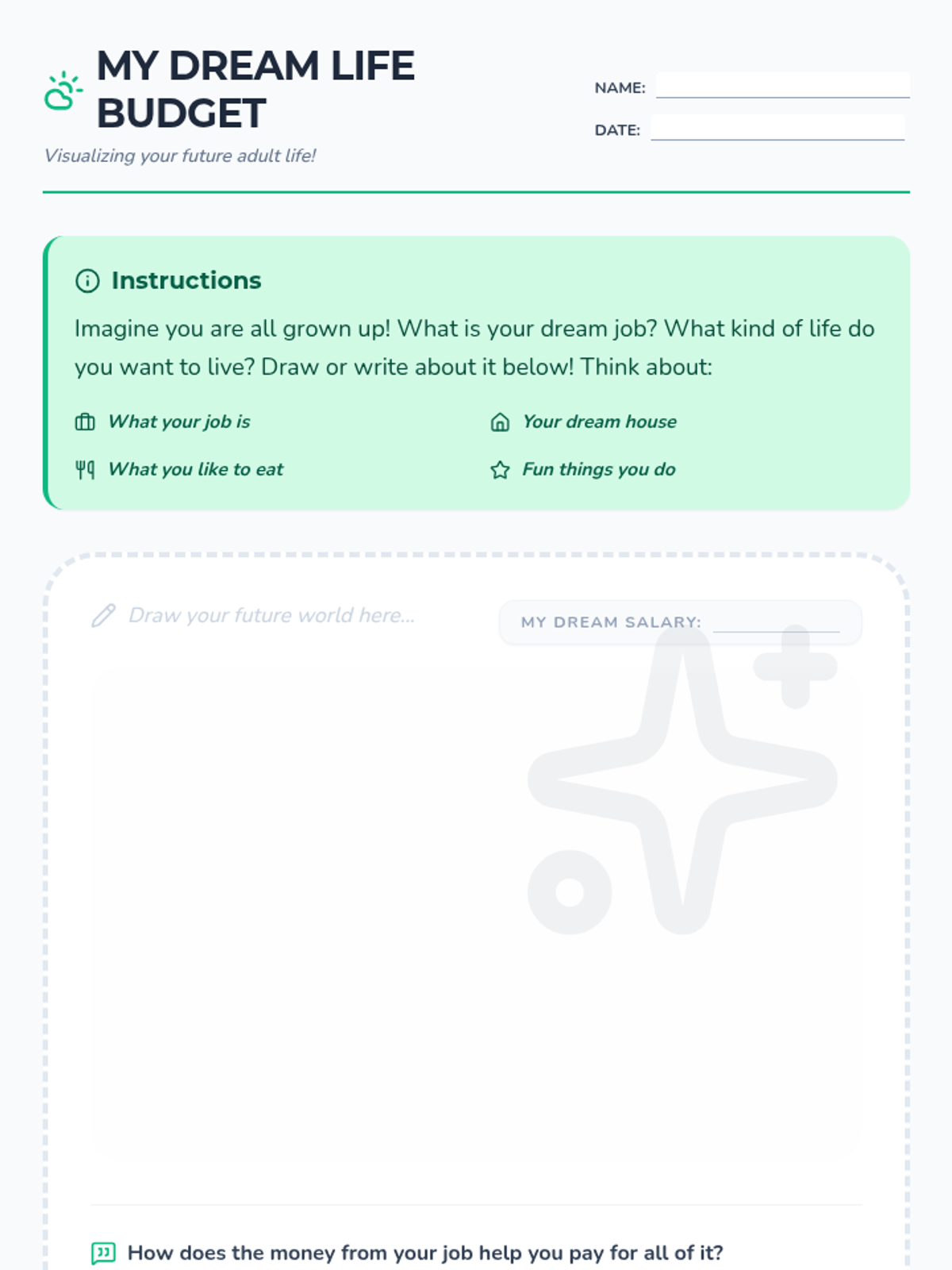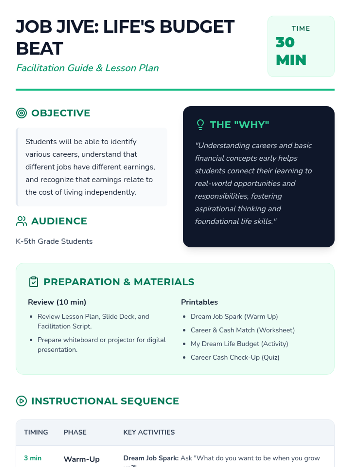 A 30-minute lesson introducing K-5th grade students to careers, salaries, and the cost of living independently through interactive discussion and budget-themed activities.