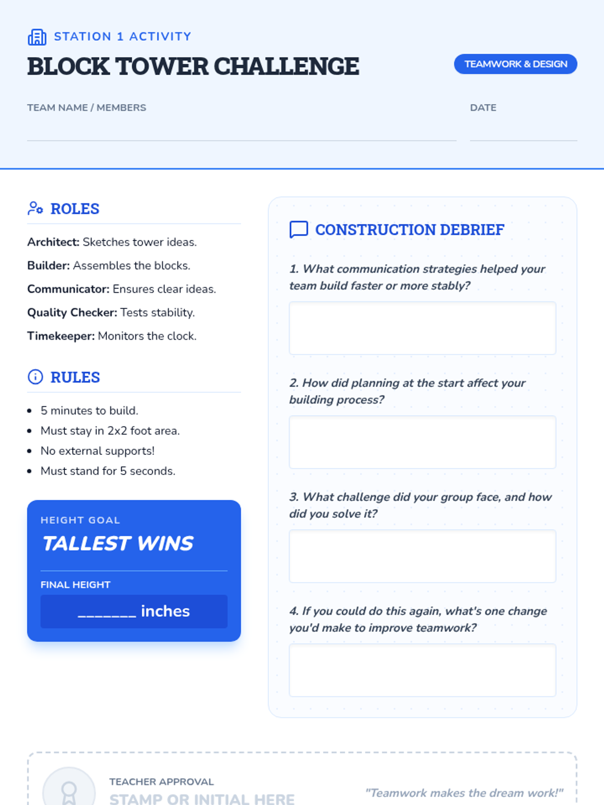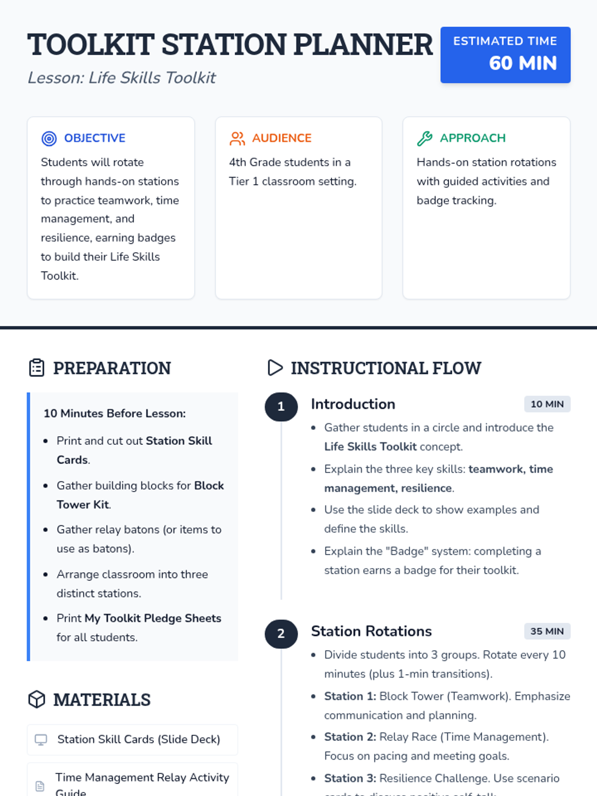 A toolkit concept where students collect essential life skills like teamwork, time management, and resilience through hands-on stations. This engaging, 60-minute lesson for 4th graders fosters critical career and life skills in a Tier 1 classroom setting.